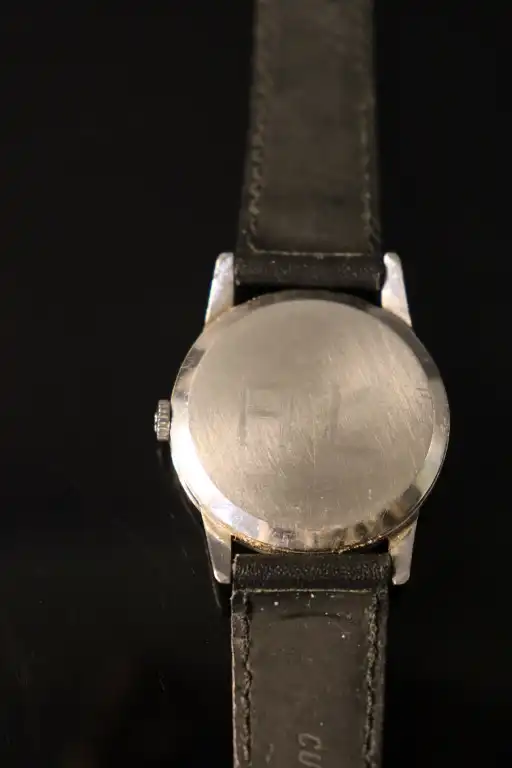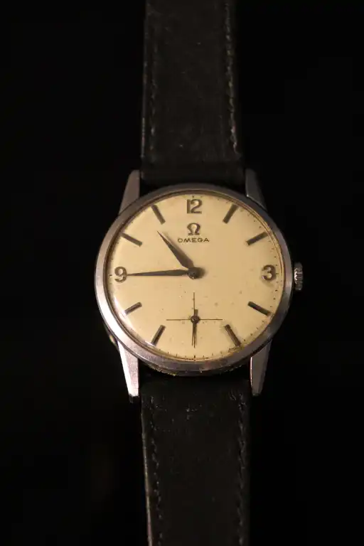 OMEGA. Montre bracelet d'homme en acier, le cadran rond signé, à chiffres romains sur fond crème et compteur des secondes à 6h. Mouvement mécanique. Bracelet en cuir noir rapporté.