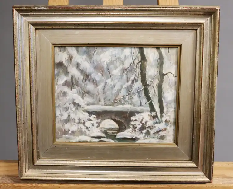 Henri MEGE (1904-1984). L'hiver près Chambéry (pont sur le ruisseau), 1980. Aquarelle et gouache, signée en bas à droite, contresignée, datée et titrée au dos. Tampon de l'atelier au dos. 19 x 24 cm à vue