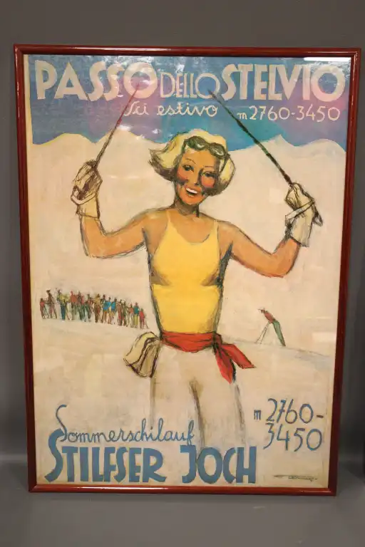 Lot de trois affiches publicitaires rééditées, comprenant : - Franz LENHART (1898-1992). "Passo dello Stelvio, sci estivo", signée en bas à droite et encadrée sous verre. 67,5 x 47,5 cm