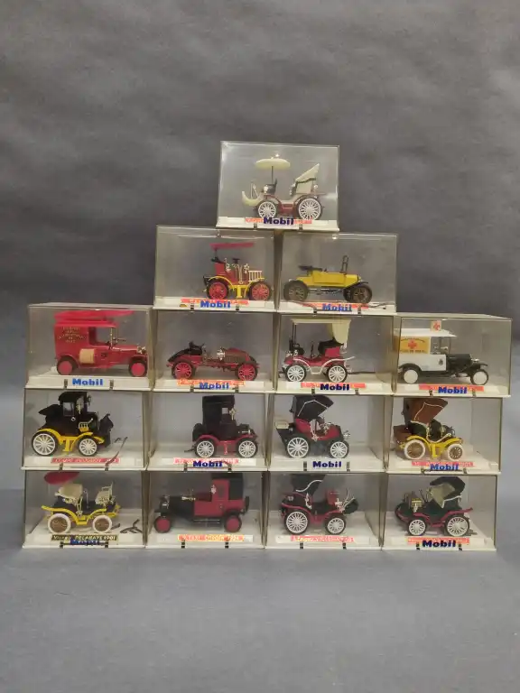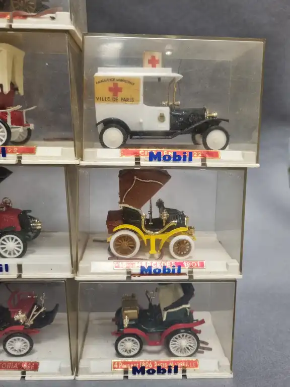 MOBIL. Lot de quinze petites voitures "ancêtres" de 1896 à 1924, dont Peugeot, Citroën, Renault, Mercedes, Fiat... (en l'état)