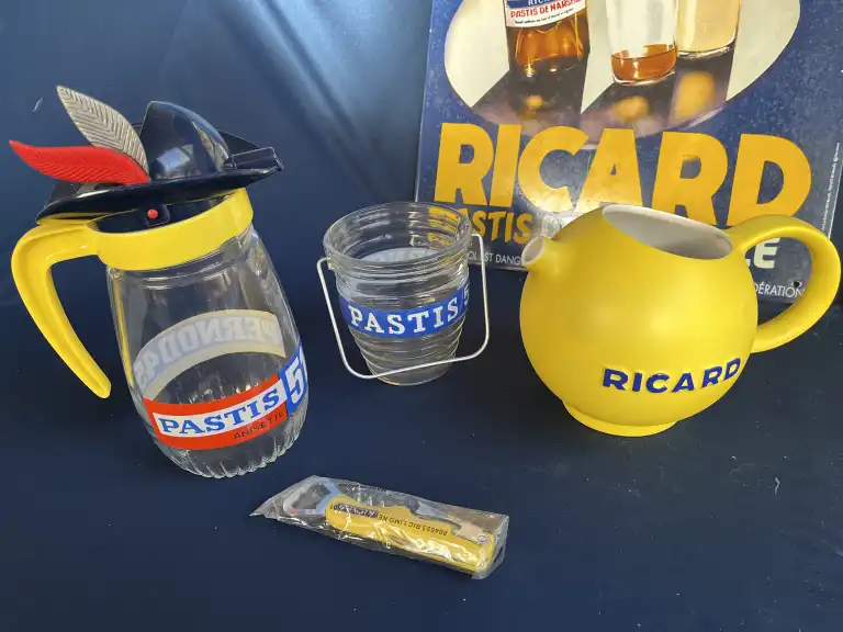 On joint un pichet en verre et un seau à glaçon logotés Pastis 51.