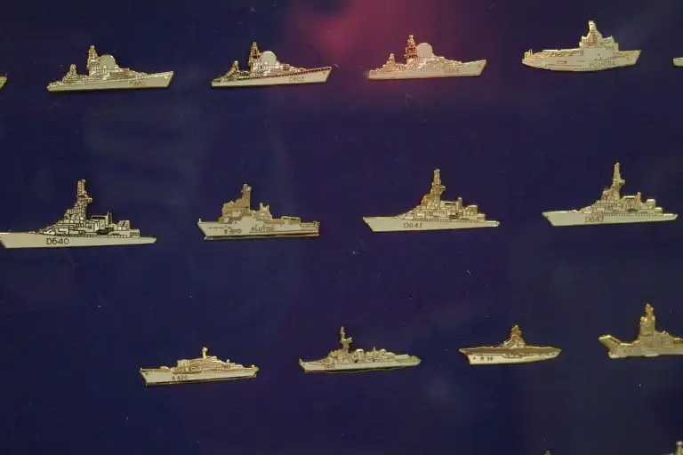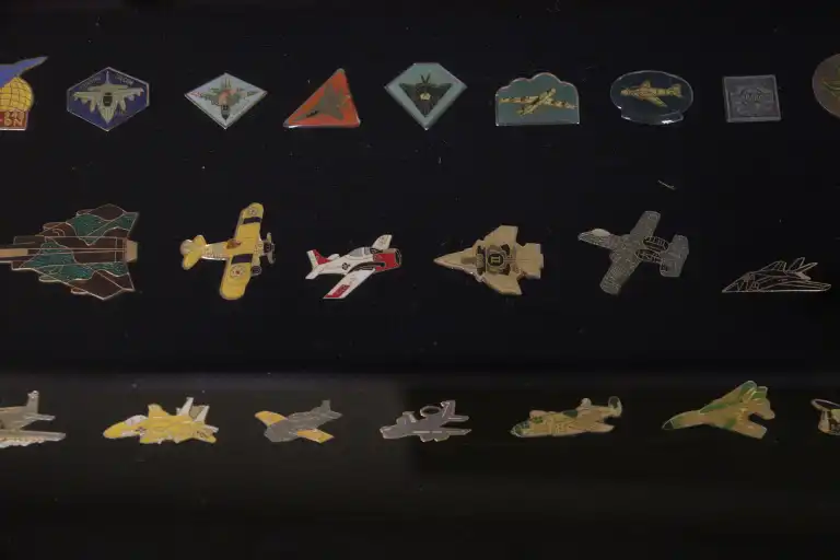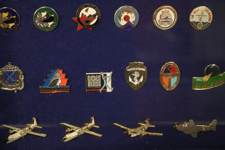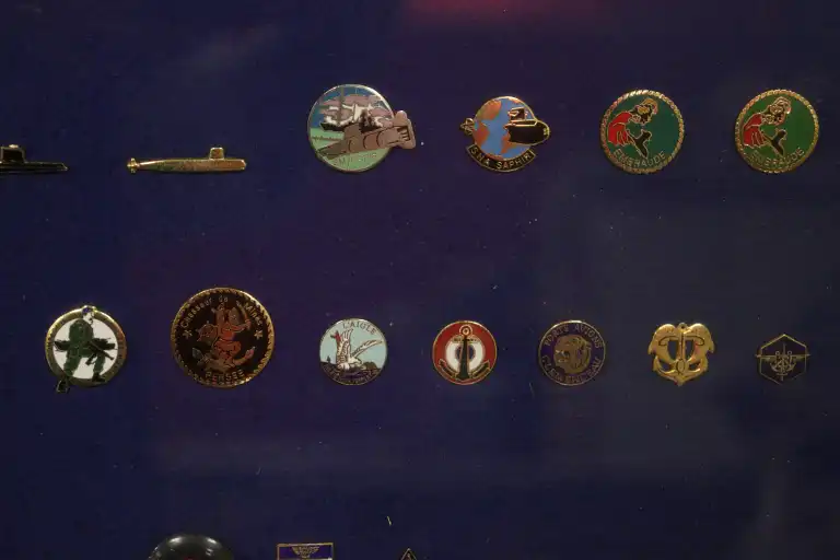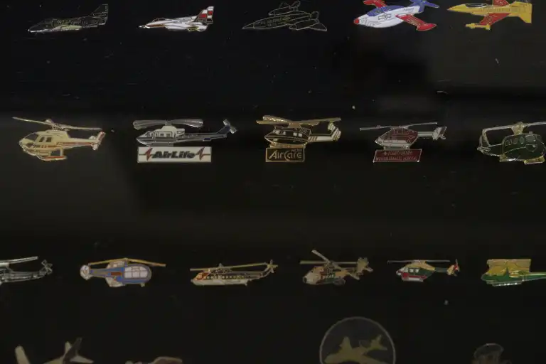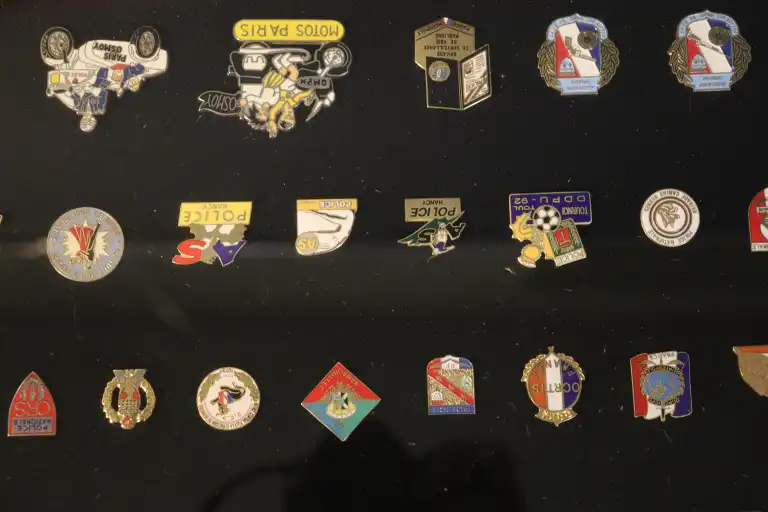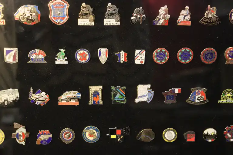 Quatre vitrines de Pin's thématiques POLICE et ARMEE dont, armée de l'air, marine, polices nationales et municipales.