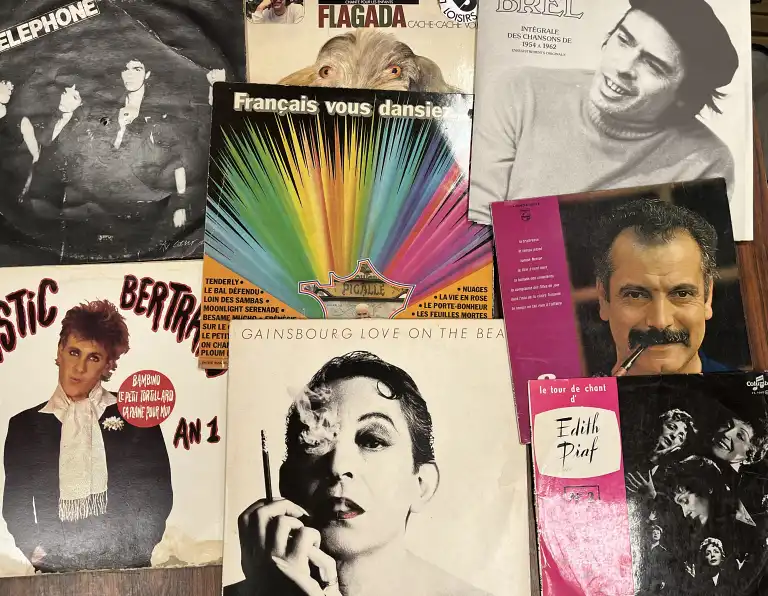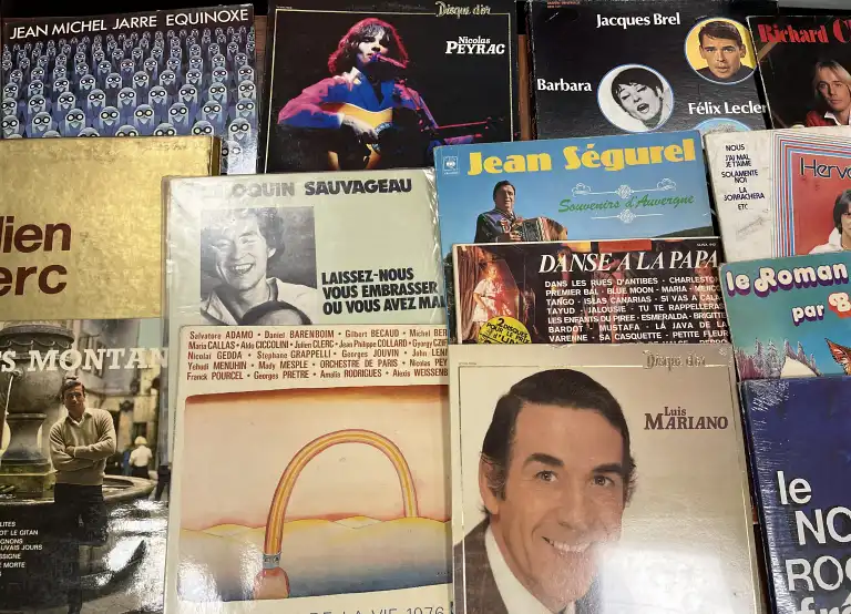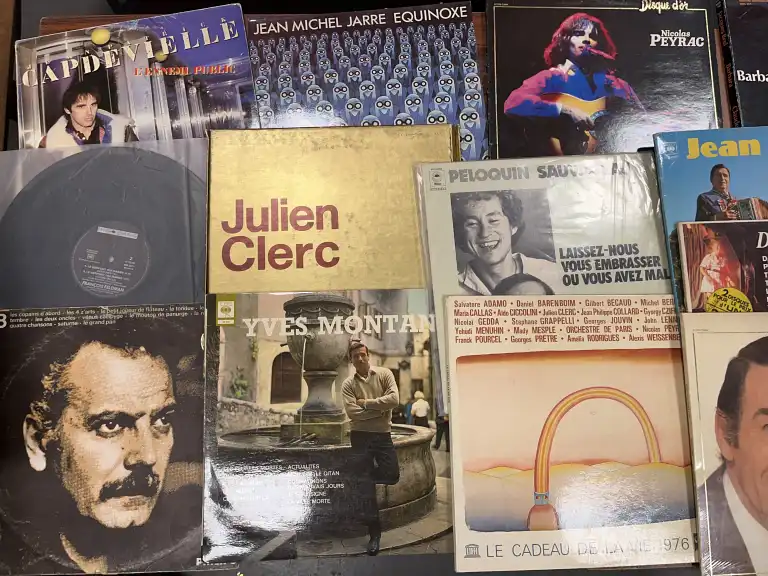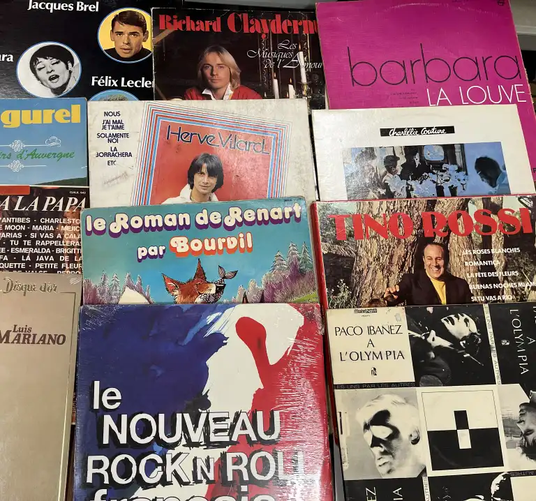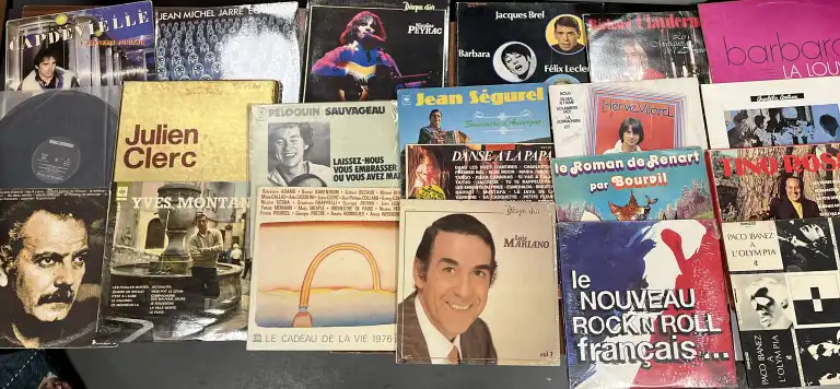 Lot d'environ 45 Vinyles, de variétés françaises, 33 tours, comprenant notamment les artistes suivants : Georges Brassens, Yves Montand, Luis Mariano, TInno Rossi, Barbara, Patricia Kaas, Hervé Vilard, Charlélie Couture, Peloquin Sovageau, Jean Michel Jarre, Renaud, Gainsbourg, Jean Ségurel, Jacques Brel, Nicolas Peyrac, Platic Bertrand, Téléphone, Bernard Lavilliers, France Gall, Michel Jonasz, Chamfort, les Inconnus, Banlieue Est, etc.