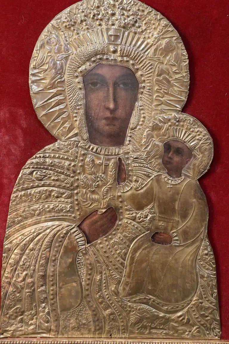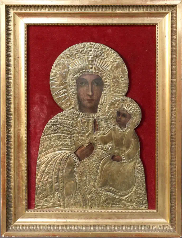 Icône représentant la Vierge à l'Enfant. Dans sa riza en laiton doré repoussé, les visages et mains imprimés, sur fond en velours rouge. 44,5 x 33 cm avec cadre