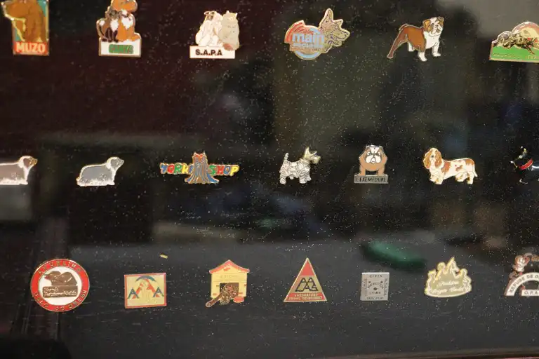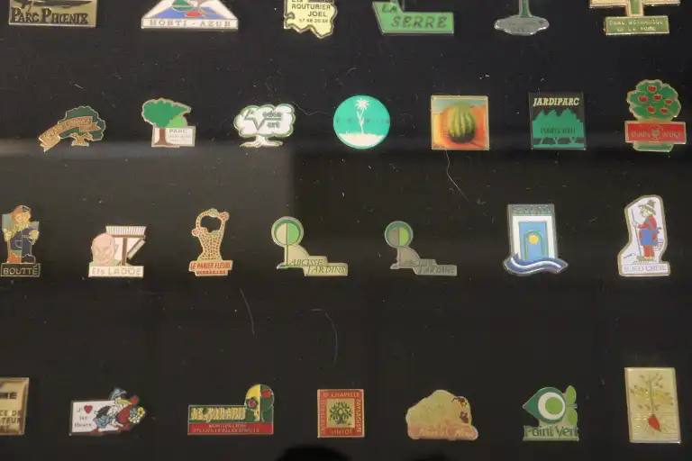 Trois vitrines de Pin's thématiques NATURE et ASSOCIATIONS dont Lions Club, animaux et végétaux (une sans vitre et incomplète).