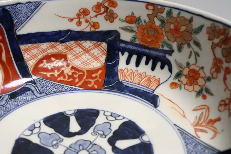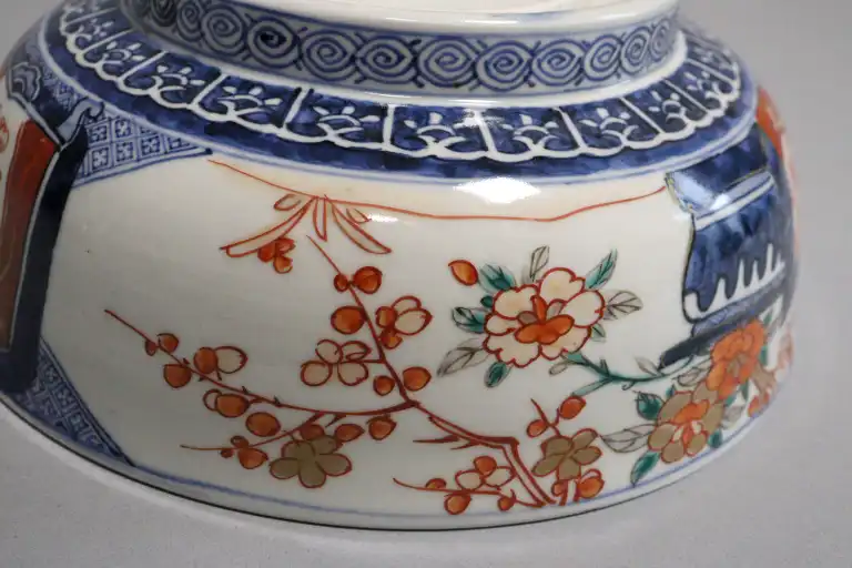 [JAPON] XXème siècle. Coupe en céramique à décor de fleurs avec supports en laiton doré. D : 21,5 cm (rayures d'usage)