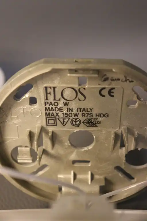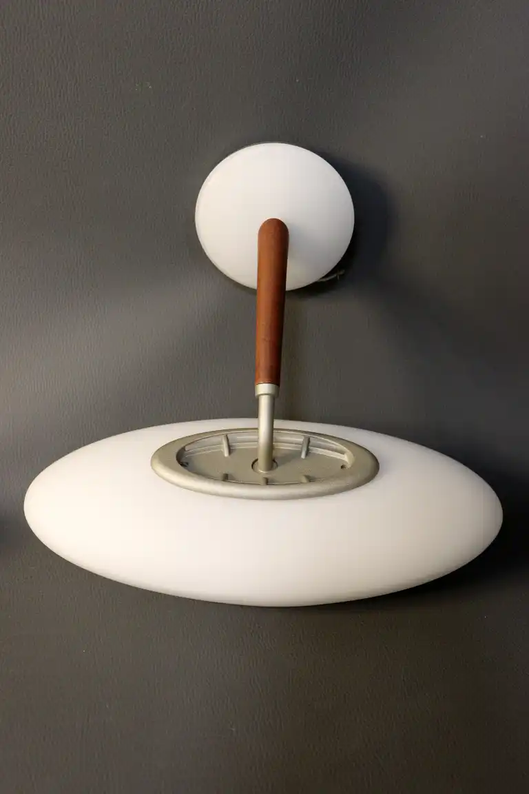 Matteo THUN (né en 1952). Edition FLOS. De la série PAO. Paire d'appliques en verre opalin blanc de forme ovale et bras en bois légèrement fuselés. Italie. L. : 34 cm