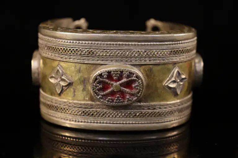 Deux bracelets l'un en argent 800/1000 et l'autre en métal argenté, partiellement doré, ornés chacun de trois pastilles ovales de cornaline en serti clos, l'un à décor de motifs stylisés ciselés et l'autre de filigranes. Travail turkmène. Poids brut : 385 g