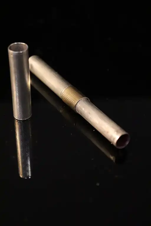 On joint : un stylo rouge à lèvres en argent 925/1000 à décor de cylindre guilloché et bague en vermeil. Poinçons crabe sur le stylo et le capuchon. Numéro de fabrication 69499. L. : 11 cm. Poids : 30 g (Traces de rouge à lèvres et enfoncement)