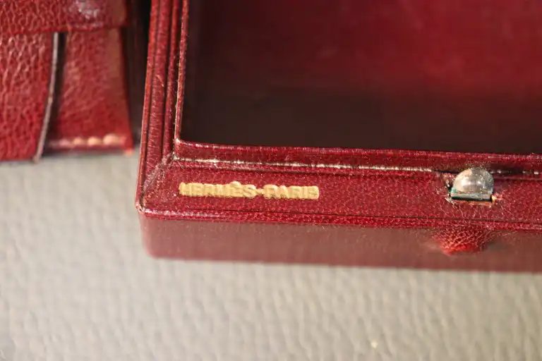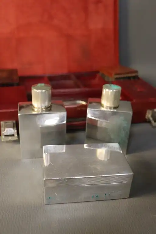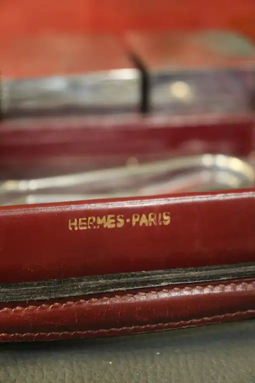 HERMES. Malette de toilette en cuir rouge contenant deux brosses, deux flacons, un étui en cuir rouge et un petit coffret en cuir rouge. Le tout estampillé de la marque.