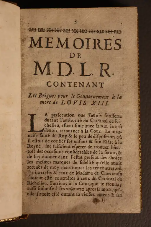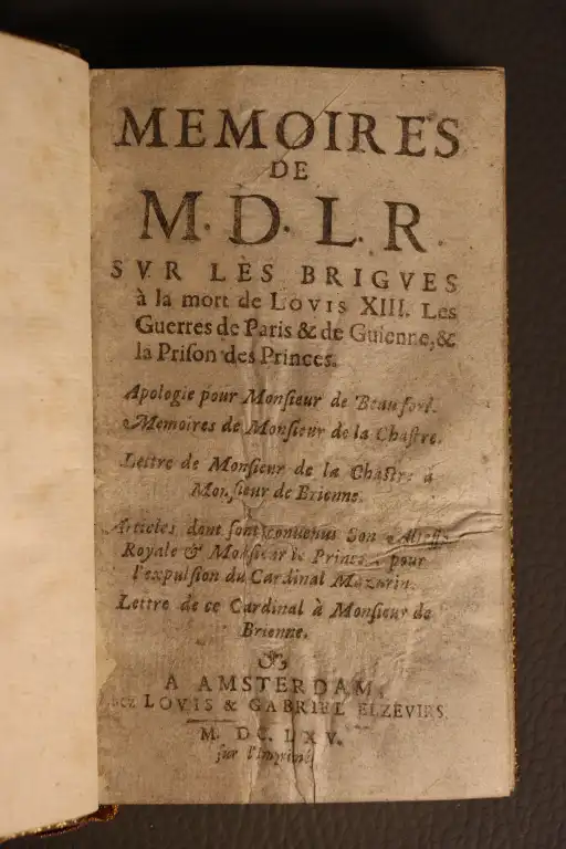 [LA ROCHEFOUCAULD] Memoires de M. D. L. R. Sur les Brigues à la mort de Louis XIII. Les guerres de Paris et de Guyenne et la prison des princes. Apologie pour M. de Beaufort. Mémoires de M. de La Chastre Amsterdam, Louis et Gabriel Elzevirs, 1665 - 1 vol. veau bronze, dos à nerfs, finement orné, p. de titre, double filet dorés encadrant les plats, coupes guillochées, guirlande dorée intérieurs, tr. dorées (petits défauts) (LEVASSEUR AINE) (page de titre restaurée)