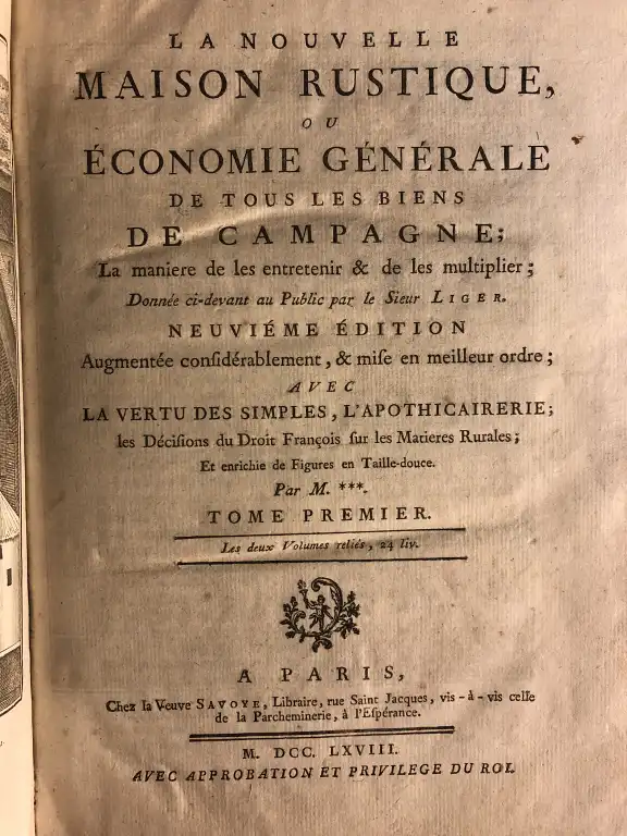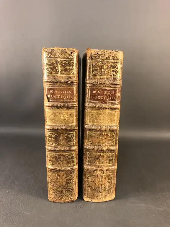 La nouvelle maison rustique, ou économie générale de tous les biens de campagne, - Neuvième édition, augmentée avec la vertu des simples, l'apothicairerie - Enrichie de figures en taille-douce - Paris, Vve Savoye, 1768 - 2 vol. in 4°, [1] iij [2] 916 pp, [4] 894 [13], basane porphyre, dos à nerfs orné, p. de titre rouge et de tomaison miel, tr. rouges, (petits défauts dt piqures, frottis, mors fendillés, des cahiers fragiles) - 37 illustrations HT (dt 3 planches dépliantes) et des illustrations in texte