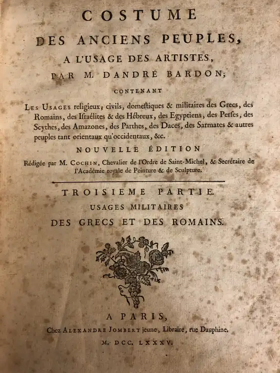 - Costumes des anciens peuples - Nouvelle édition - Troisième partie - usages militaires des grecs et des romains - Paris, Jombert jeune, 1785 - et Quatrième partie uages religieux des perses - Paris, Didot, Jombert jeune, 1786 - In 4°, [2] 40 pp, 97 planches HT, [1] 40 pp 60 planches HT, demi-basane, dos lisse, p. de titre et de tomaisons (défauts à la reliure) (rousseurs)