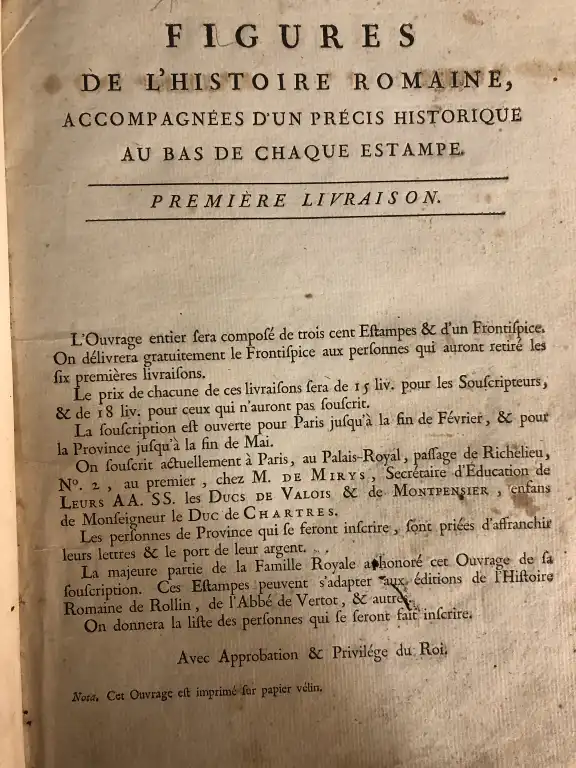 - Figures de l'histoire romaine, accompagnées d'un précis historique au bas de chaque estampe - Il y a plusieurs livraisons - Cet ouvrage est imprimé sur papier vélin - In 4°, demi-basane bronze à coins (défauts à la reliure dt coins manquants, frottis, ...) (rousseurs et tâches) 48 planches