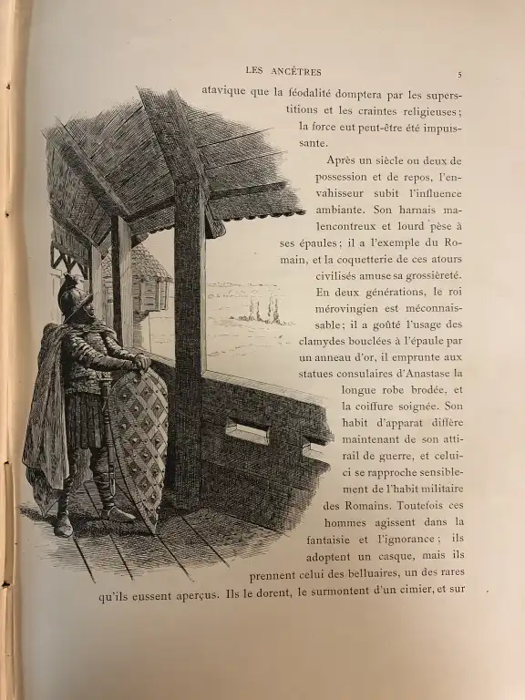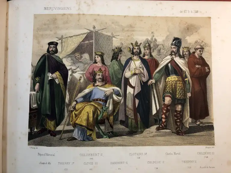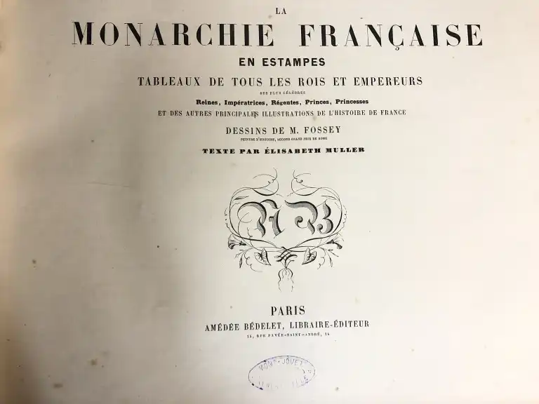 - La monarchie française en estampes - Tableaux de tous les rois et empereurs - Dessins de M. Fossey - Texte par E. Muller - Paris, Bedelet, sd - In 4° oblong, demi-basane rouge (défauts à la reliure) (cachet humide) (des piqures) 15 planches HT en couleurs