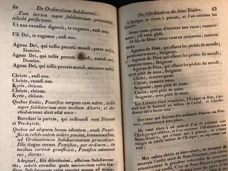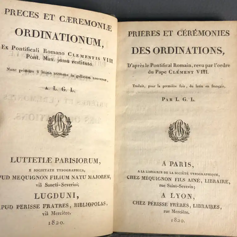 Prières et cérémonies des ordinations, d'après le Pontifical Romain, revu par l'ordre du Pape Clément VIII, traduit pour la première fois, du latin en français, par L. G. L. - Paris, Lyon, Méquignon, Périsse, 1820 - In 12°, maroquin vert sapin à long grain, dos lisse finement orné, filet et guirlande dorée encadrant un décor à froid sur les plats, coupes guillochées, tranches dorées (petits défauts dt frottis, coiffes abimées) - Texte latin en regard