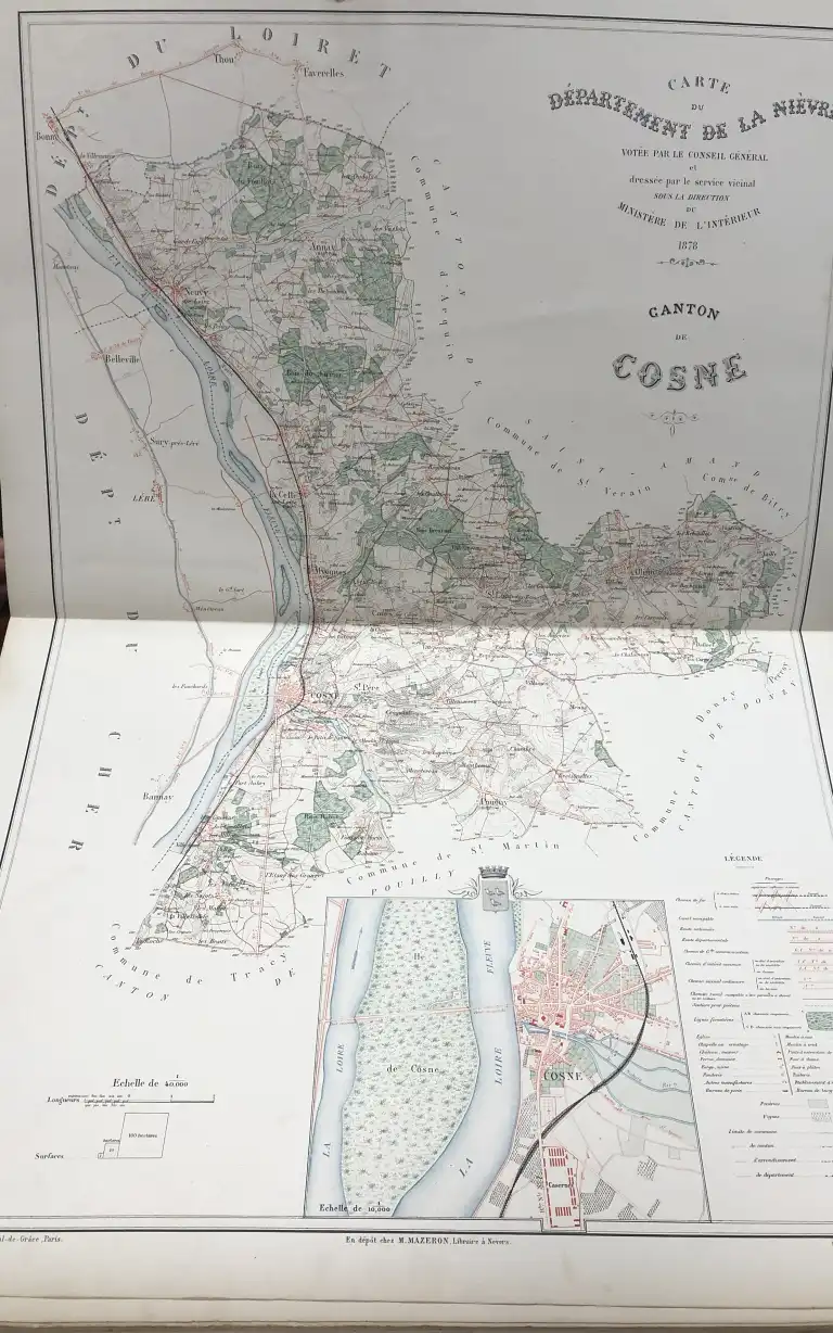 Atlas des cartes cantonales du département de la Nièvre - A l'échelle de 1/40000 dressé par le service ordinaire des ponts et chaussées chargé du service viginal - Nevers, Mazeron, 1878 - In plano, p. de titre, table alphabétique des cantons, 25 cartes à double page (complet), et une carte dépliante entoillée (mouillures, rousseurs) du département de la Niévre dressé par M. Quaisain, reliure explosée dont plats détachés, traces de doigts, quelques cartes abimées.