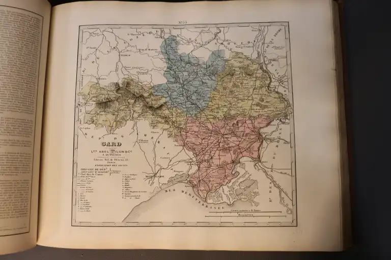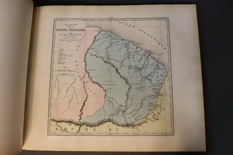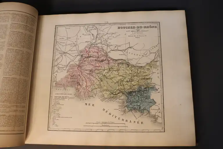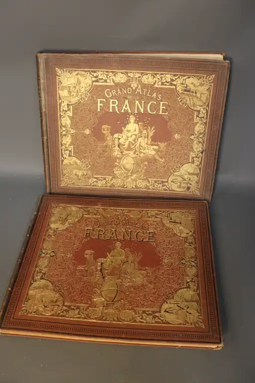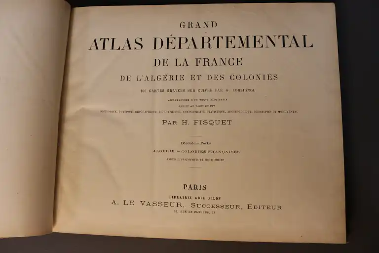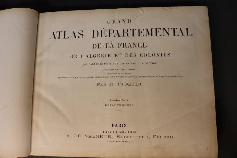 FISQUET - Grand atlas départemental de la France, de l'Algérie et des colonies - 106 cartes gravées sur cuivre par Lorsignol - Paris, Levasseur, sd - 2 vol. in folio oblong, cartonnage éditeur illustré (défauts dt déchirures sur les 4 premières pages sans manque) - Il manque la carte n°3