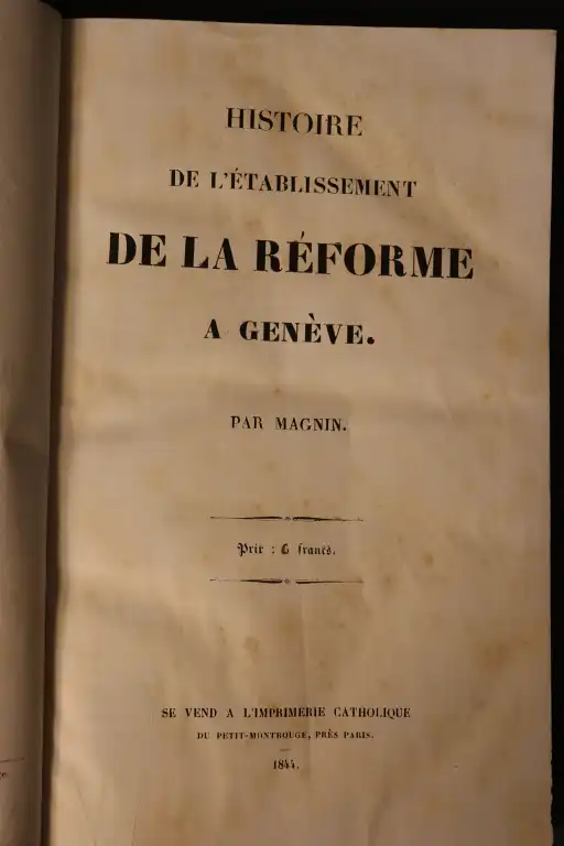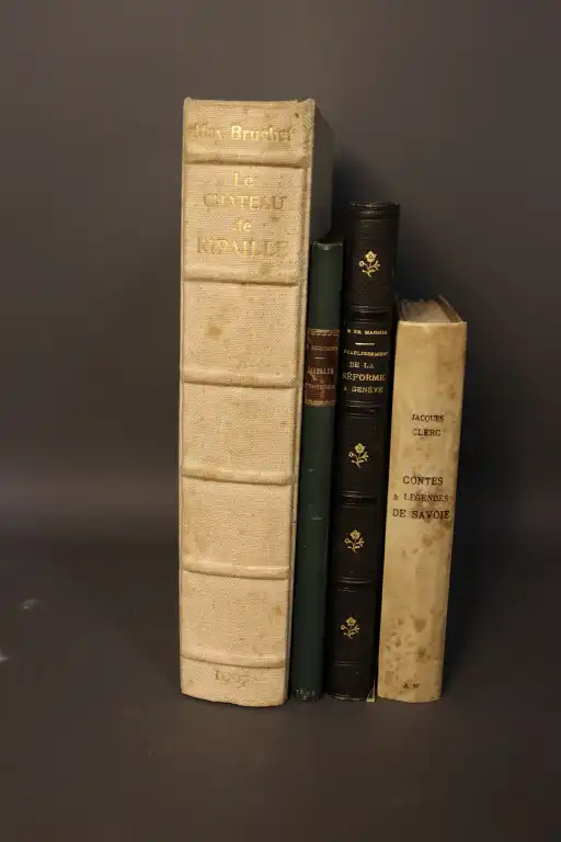 - CLERC - Contes et légendes de Savoie - Illustrations d'Amélie Charpy - Annecy, Gardet et Garin, 1950 - In 8°, velin, couv. cons. - Un des 100 ex. ntés sur velin de renage - MAGNIN - Histoire de l'établissement de la réforme à Genève - paris, Impr. catholique, 1844 - In 8°, demi-chagrin noir, dos à nerfs, tr. dorées