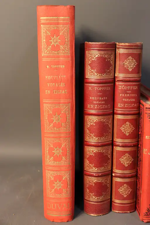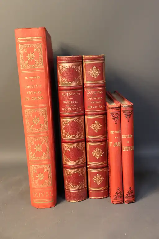 TOPFFER - Ensemble de 5 livres : - Premiers voyages en Zigzag ou excursions d'un pensionnat en vacances - Septième édition - Paris, Garnier, 1868 - Petit in 4°, demi-chagrin rouge, dos à nerfs orné, tr. dorées (plats mouillés, intérieur défraichi)