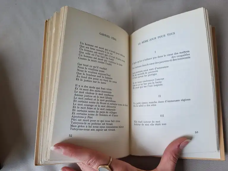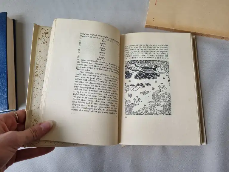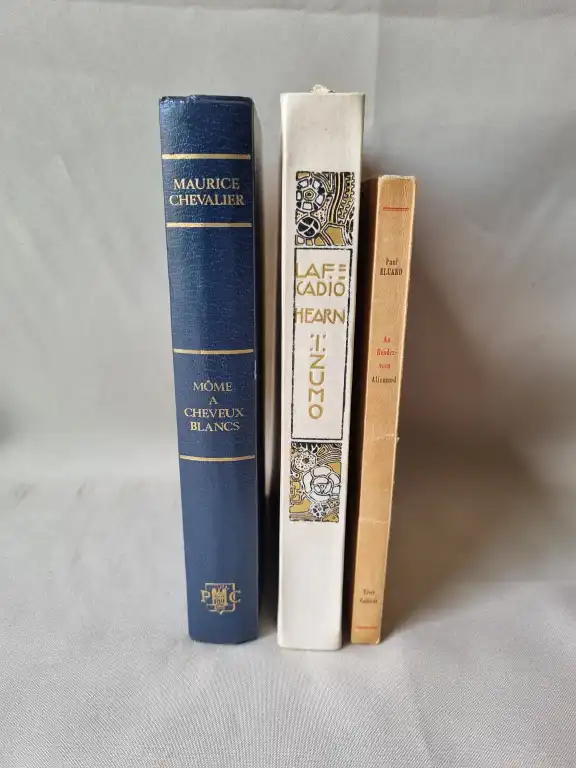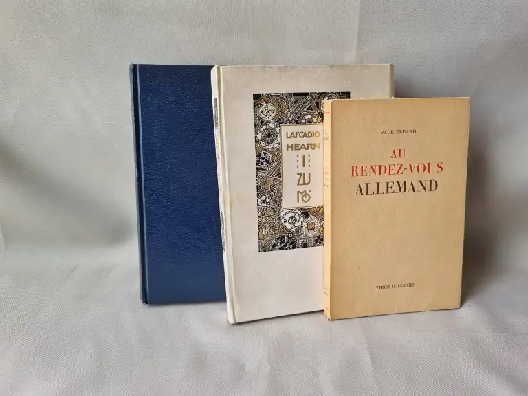ELUARD (Paul) - Au rendez-vous allemand - Genève, Editions des Trois Collines, 1945 - In-12°, broché, couv. Impr. Rempl. - En frontispice, portrait d'Eluard par Picasso - Envoi sur le fx-titre : à Madame Odette R qui unit la grâce à la gentillesse - CHEVALIER (M.) - Môme à cheveux blancs - Presses de la Cité - In 8°, percale bleue éditeur - Envoi sur le fx-titre - LAFCADIO HEARN - Izumo - Blicke in das unbekannte japan - Frankfurt, 1910 - In 8°, reliure art déco éditeur (petits défauts à la reliure)