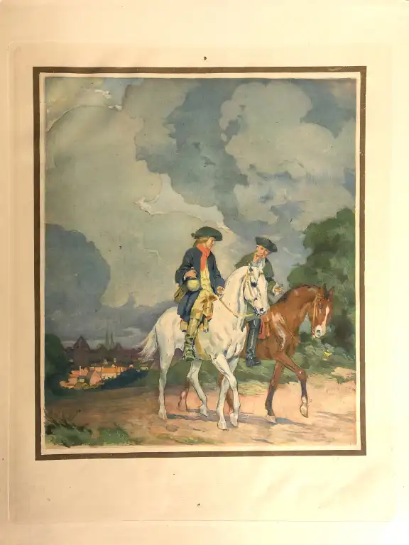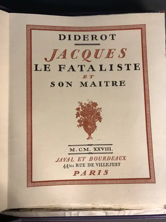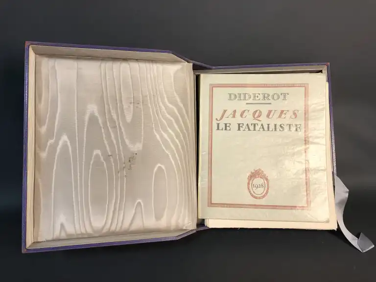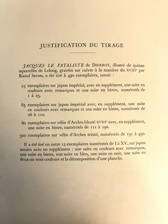 DIDEROT (Denis) - Jacques le fataliste et son maître - Paris Javal et Bourdeaux 1928 - In-4, en ff., couverture impr. rempliée, étui-boite violet (défauts à l'étui dt mors sup. fragile, insolé, ...). Illustré de 15 aquarelles de Lelong gravées sur cuivre à la manière du XVIIIe par Raoul Serres, sous serpentes, tirées en couleurs sur les presses de Padovani Tirage à 490 exemplaires, ici un des XV ex. ntés sur japon ancien avec en supplément : une suite en couleurs avec remarques, une suite en noire, une suite en bleu, une suite en noire avec remarques, une suite en deux ou trois couleurs et la décomposition d'une planche