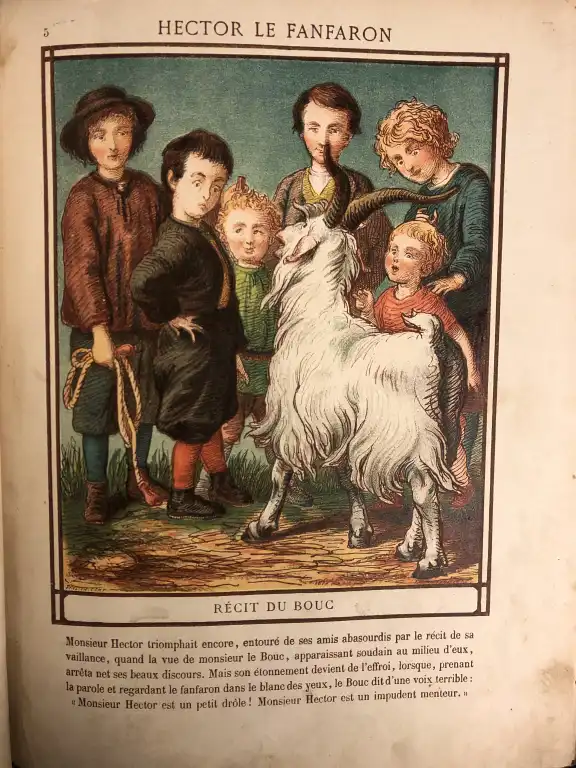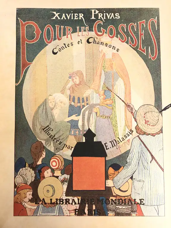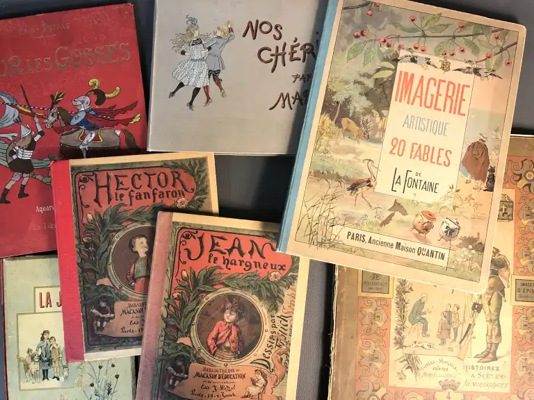 [ENFANTINA] Ensemble de 7 ouvrages (Etat moyen) : - PRIVAS (Xavier) - Pour les gosses contes et chansons - Illustrés par E. Malassis - Paris, Librairie mondiale, sd - In 4°, percale rouge illustrée au 1er plat éditeur, dos lisse (défauts dt reliure abimée, mouillures) - STAHL - Hector le Fanfaron - Jean le Hargneux - 8 gravures imprimées en couleurs par Froelich -Paris, Hetzel, sd - 2 vol. petit in 4°, dos refait, 1er plat illustré (défauts) - Mars - Nos chéris - Paris, Plon Nourrit, sd - In 8°, oblong, percale grise illustrée éditeur (défauts) - ARNAUD - La journée de bébé - Illustrations de Bouisset - Paris, Quantin, sd - In 8°, demi-percale rouge, cartonnage illustré (défauts) - Imagerie artistique - 20 fables de la Fontaine T2 - Paris, Quantin, sd - Petit in folio, demi-percale turquoise, plats illustrée (reliure détachée) (petits défauts) - Série supérieur aux armes d'Epinal - Contes moraux, contes merveilleux, Histoire et scène humoristique - In folio, demi-percale grise, plats illustrés, (défauts dt reliure abimée) page titre détachée - Planches de 101 à 110, 71,72, de 113 à 125, déchirures à qqs planches