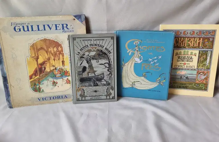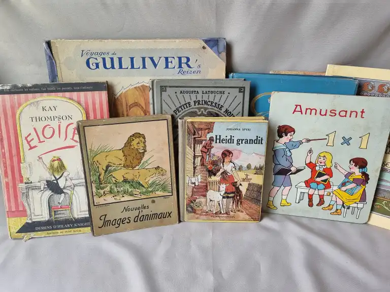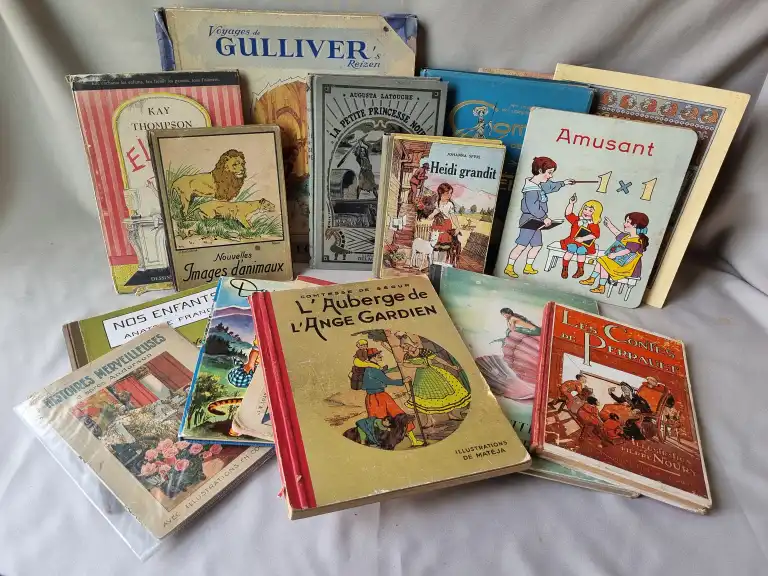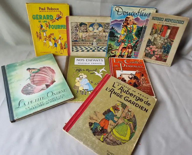 ENFANTINA - Ensemble de 17 livres dont : - Un jeu de l'oie renouvelé des grecs - jeu de plaisi et de récréation - Paris, Mauclair Dacier, sd - contre-collé sur un carton rouge dépliant en 4 parties (défauts) - Voyages de Gulliver's reizen - Biscuits, chocolats, confiseries Victoria à Bruxelles - In 4° carré, (défauts) Texte en français et flamand - Complet des vignettes à coller - LATOUCHE - La petite princesse noire - Delagrave, 1932 - In 8°, percale grise illustrée éditeur (petits défauts) - REBOUX - Gérard et les fourmis - ill. de Le Petit et Jodelet - Flammarion, 1932 - In 8°, cartonnage éditeur - Envoi de l'auteur sur le fx-titre - ANDERSEN - La petite Ondine - Illustré par Bernet - In 4°, cartonnage illustré éditeur (frottis, piqures) - etc...