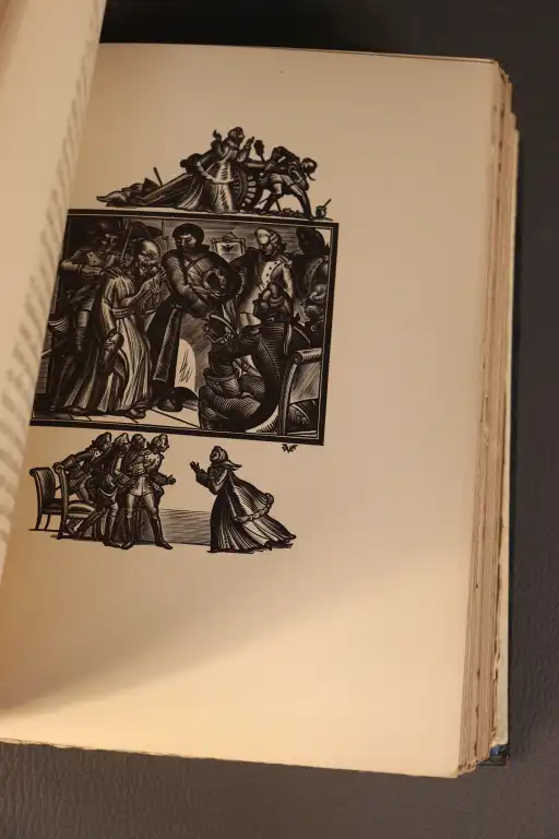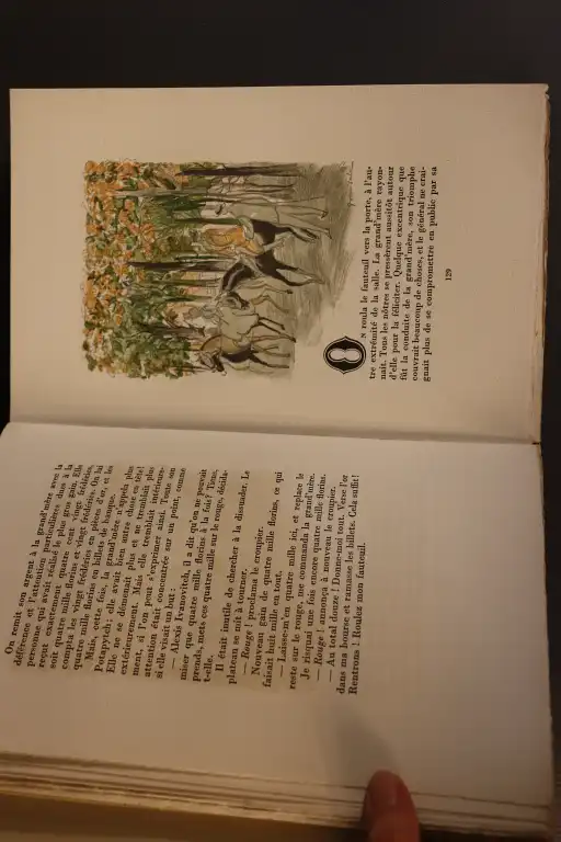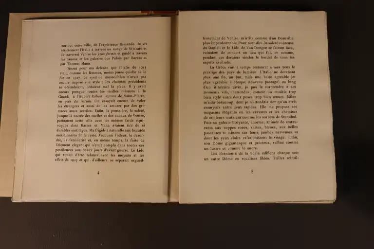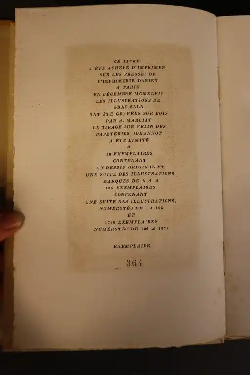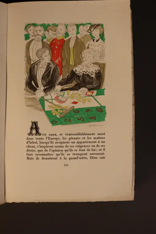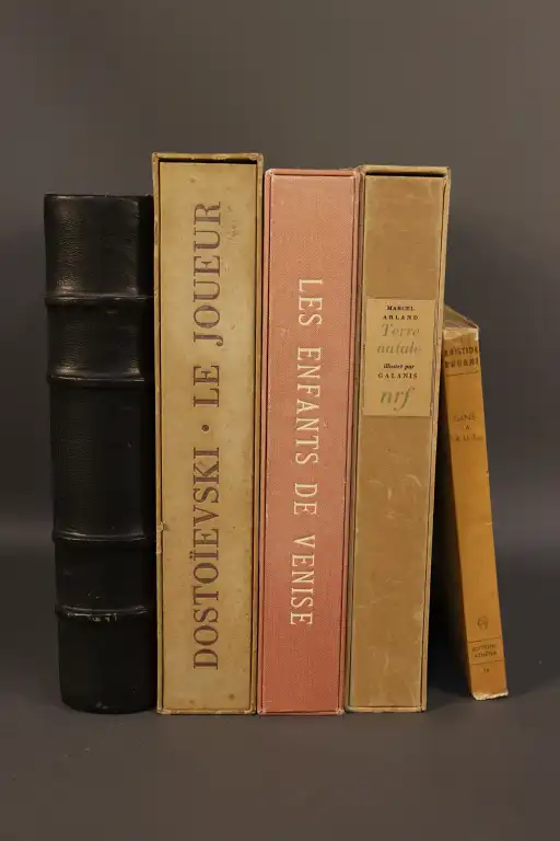 LITTERATURE - Ensemble de 5 ouvrages : - POUCHKINE - La fille du capitaine - d'après la traduction de Louis Viardot - Avec des bois gravés par V. Le Campion - Les bibliophiles du Faubourg et du Papier, 1953 - Gd In 8°, chagrin bleu nuit, dos nerfs muet, couv. et dos cons. (frottis) - DOSTOIEVSKI (Fedor) - Le joueur - Traduction de Sylvie Luneau - Illustrations de Grau Sala - Paris, Hazan, 1947 - Gd in 8°, broché, couv. impr. rempl., chemise, étui (poussiéreux, frottis) - FRAIGNEAU - Les enfants de Venise - Orné d'eaux-fortes par François Salvat - Le livre et l'estampe, 1944 - Gd in 8° en ff., couv. impr. rempl., chemise, étui - Un des ex. nté - ARLAND (Marcel) - Terre natale - Edition illustrée de quatorze gravures à l'eau-forte par D. Galanis - Paris, NRF, 1945 - Gd in 8°, broché, couverture impr. rempl., chemise, étui (étui abimé) - BRUANT (Aristide) - Dans la rue - 10 HT in texte et culs de lampes de Van Elsen - Collection Athena Luxe, 1946 - In 8°, broché