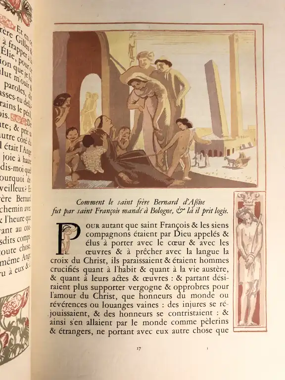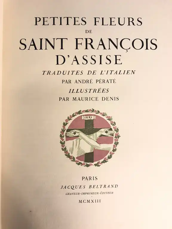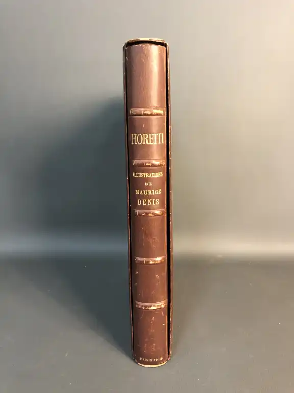 [DENIS] Saint FRANCOIS D'ASSISE. Petites fleurs. Traduites de l'italien par André Pératé - Illustrées par Maurice Denis - Paris, Jacques Beltrand, 1913 - Grand in-4, maroquin bleu nuit, doublure en maroquin, dos à nerfs, date en queue, tête dorée, tranches dorées sur témoins, couverture et dos conservés, chemise, étui (René AUSSOURD) (chemises et étuis avec défauts dt mors intérieurs abimés, dos frotté, acrocs à l'étui, ...) Illustrations de Maurice Denis gravées sur bois en couleurs par Jacques, Marcel, Camille et Georges Beltrand, dont un hors-texte, dans le texte, de nombreux ornements (bandeaux, lettrines, cul-de-lampe et vignettes) et encadrement du texte à chaque page. Tirage limité à 120 exemplaires - Exemplaire imprimé pour M. Marguillier non numéroté