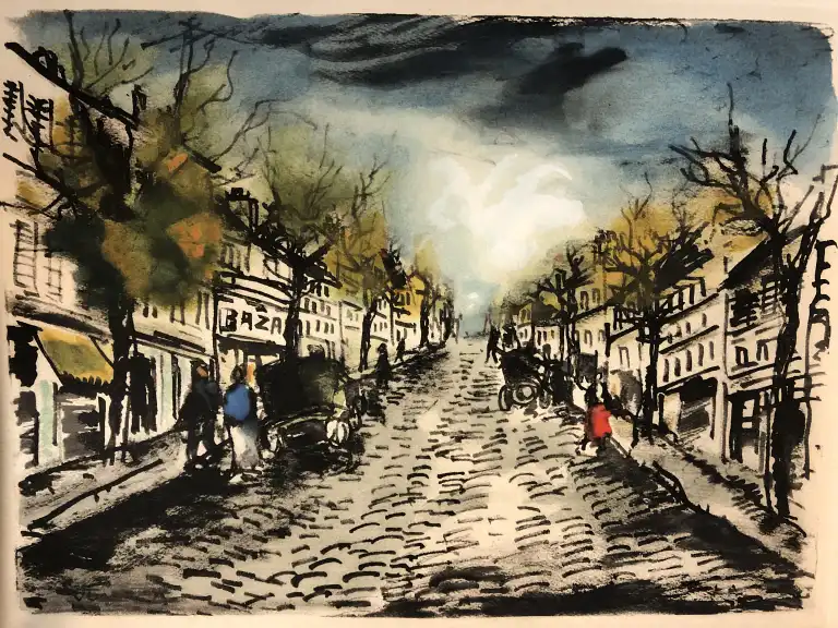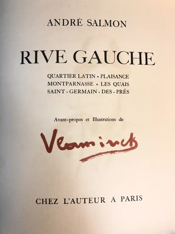 SALMON (André) - Rive gauche. Quartier Latin - Plaisance - Montparnasse - Les Quais - Saint-Germain-des-Prés. Avant-propos et illustrations de Maurice de Vlaminck - Paris, chez l'Auteur, 1951 - In-4, en ff., couverture illustrée, chemise, étui-boite (défauts dont piqures dans la marge, papier parfois jauni, étui poussiéreux) Un des 250 ex. ntés sur vélin d'Arches Le portrait de Vlaminck par lui même contre signé au crayon est en double Le portrait de Berthe par Modigliani est dénommé sur le dessin Dona Elvira, don Rodrigue