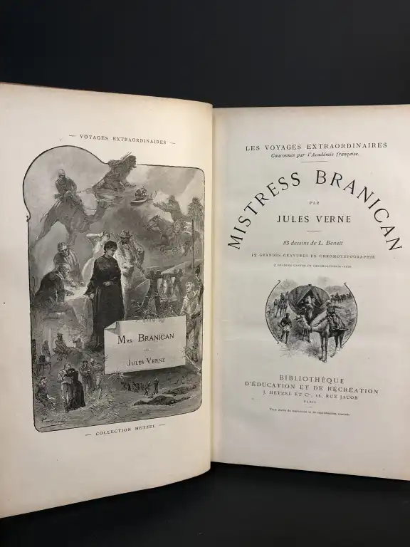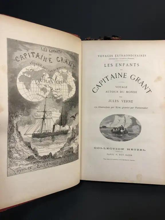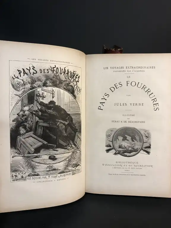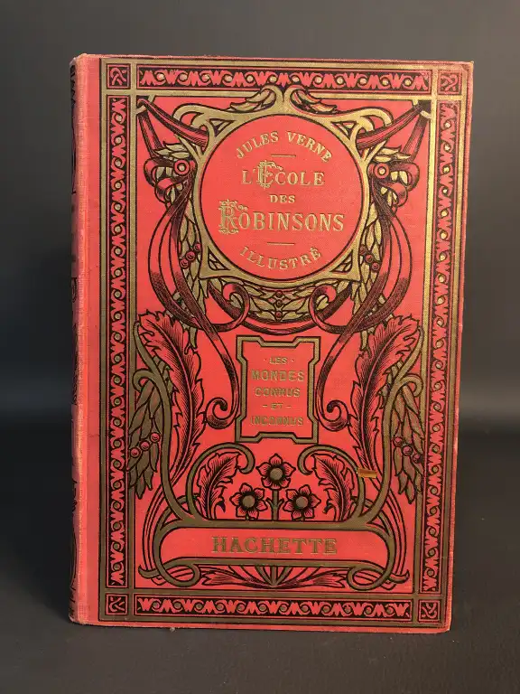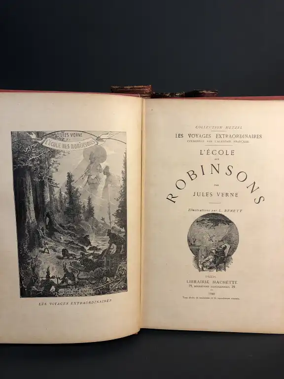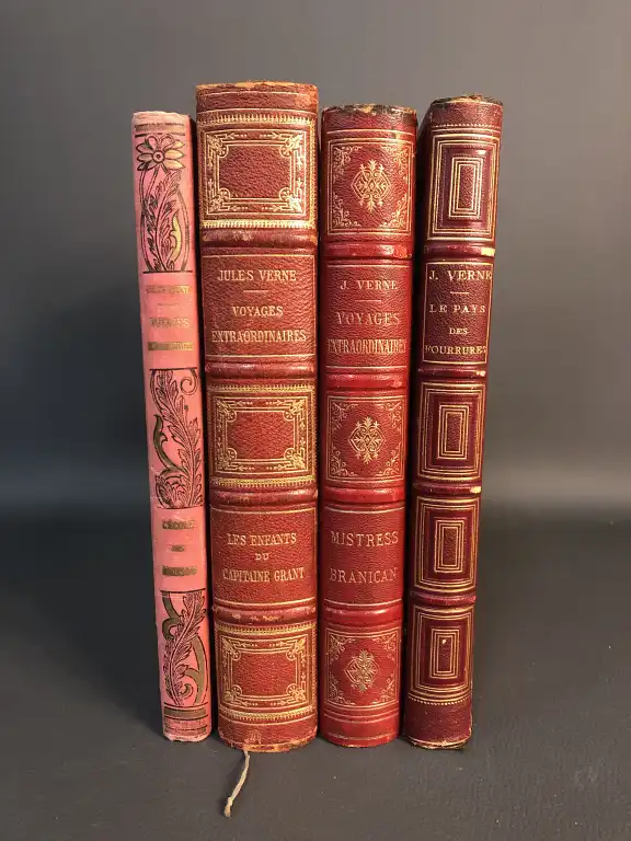 VERNE (Jules) - Ensemble de 4 vol. : - L'école des Robinsons - Illustré par Benett - Hachette, 1940 - Gd in 8°, toile illustrée rouge éditeur (petits défauts dont dos insolé), - Le pays des fourrures - Illustré par Férat et de Beaurepaire - Paris,Bibliothèque d'éducation, Hetzel, sd - Gd in 8°, demi-chagrin rouge, dos à nerfs, tr. dorées (petits défauts dt frottis,...), - Mistress Branican - 83 dessins de L. Benett - 12 grandes gravures en chromotypographie - Paris,Bibliothèque d'éducation, Hetzel, sd - Gd in 8°, demi-chagrin rouge, dos à nerfs, tr. dorées (défauts dt frottis,...), - Les enfants du capitaine Grant - 172 illustrations par Riou - Paris, collection Hetzel, sd - Gd in 8°,demi-chagrin rouge, dos à nerfs, tr. dorées (défauts dt frottis,...)