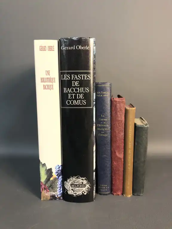 [GASTRONOMIE] Ensemble de 6 livres : - FOUCON - La cuisine et la patisserie enseignées par l'image - Geneve, Sonor, sd - In 8°, percale bleue éditeur - Illustration HT - L'idéal du patissier traiteur moderne - Aide-mémoire - Lyon, Spay, sd - Pt in 8°, (défauts dt mors intérieur fragile) - HEYRAUD - Le manuel du restaurateur - Résumé de cuisine courante - Deuxième édition - Sl, sn, sd - In 12°, percale marron éditeur (défauts dt mors intérieurs fragiles) - CARDELLI - Manuel du cuisinier et de la cuisinière - Nouvelle édition - Paris, Roret, 1830 - In 18°, demi-bradel, percale verte muette, dos lisse (défauts dt mouillures, rousseurs) - Frontispice et 3 planches dépliantes (rousseurs et accrocs) - Il manque la planche 4 - OBERLE (Gérard) - Une Bibliothèque bachique - Paris, Loudmer, 1993 - In-4, toile, jaquette illustrée - OBERLE (Gérard) - Les fastes de Bacchus et de Comus, ou histoire du boire et du manger en Europe, de l'Antiquité à nos jours, à travers les livres - Paris, Belfond, 1989 - In-4, toile, jaquette illustrée
