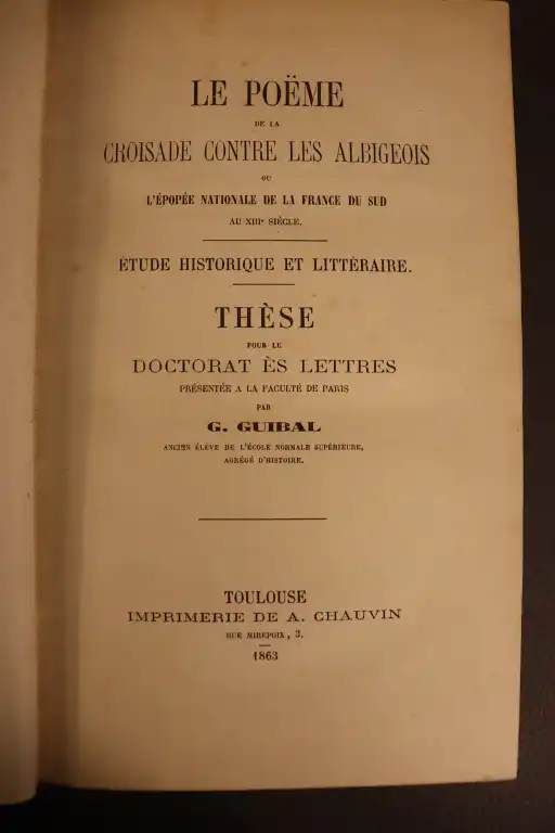- GUIBAL - Le poëme de la croisade contre les Albigeois ou l'épopée nationale de la France du sud au XIII-e siècle - Toulouse, A. Chauvin, 1863 - In 8°, demi-chagrin, dos à nerfs orné, (rares piqures)