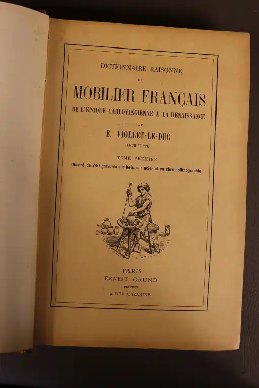 - VIOLLET LE DUC - Dictionnaire raisonné du mobilier francais de l'époque caroligienne à la renaissance - Paris, Grund, sd - 6 vol. in 8°, demi- à coins, dos à nerfs, p. de titre (papier jauni) (petits défauts à la rel. dt frottis) Illustrations en couleur et en noir HT et en noir dans le texte