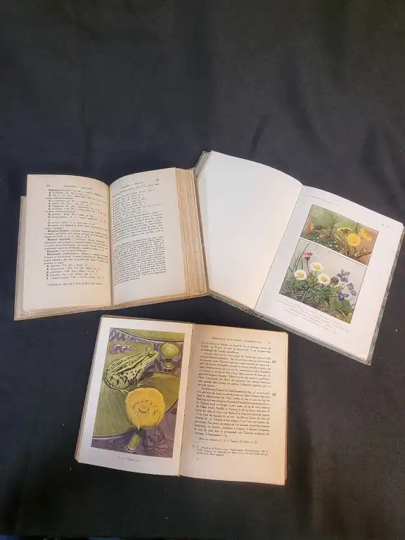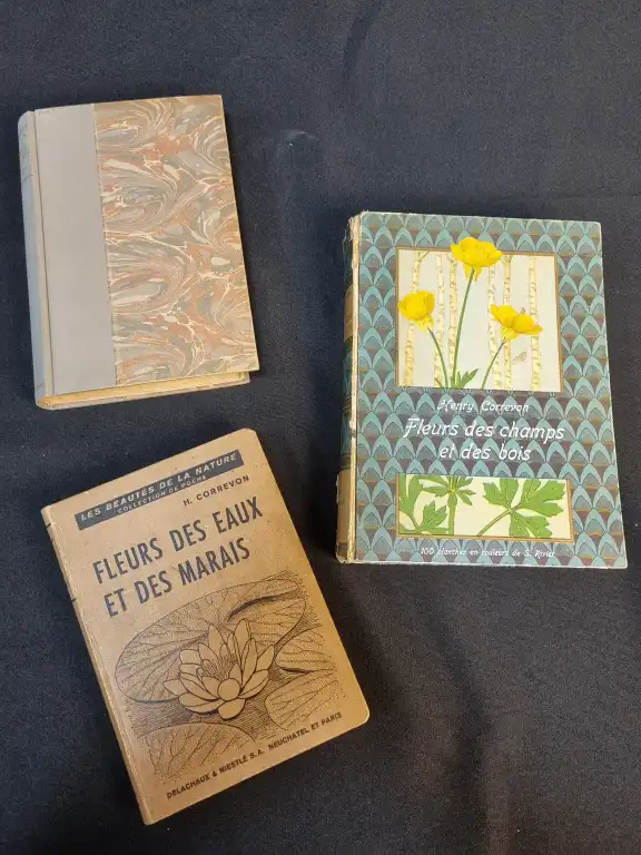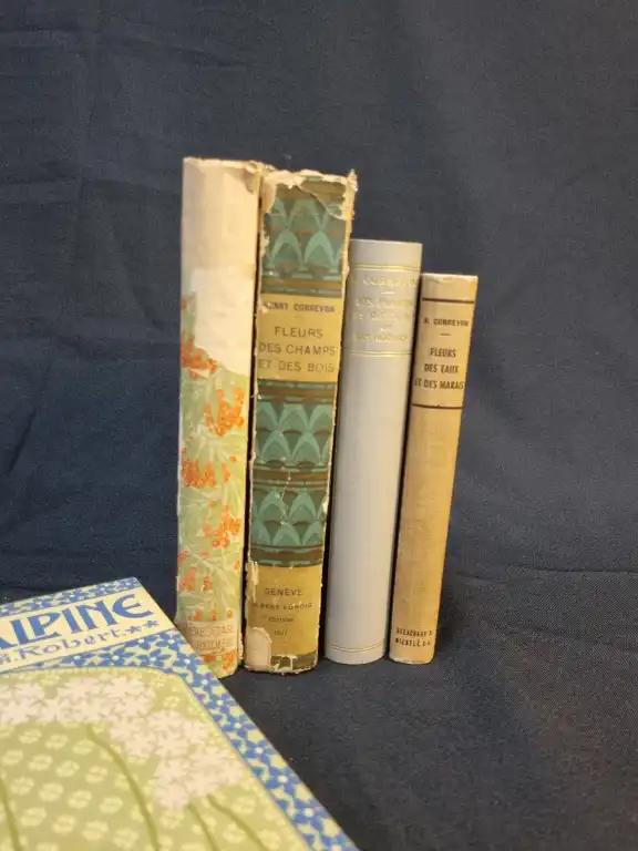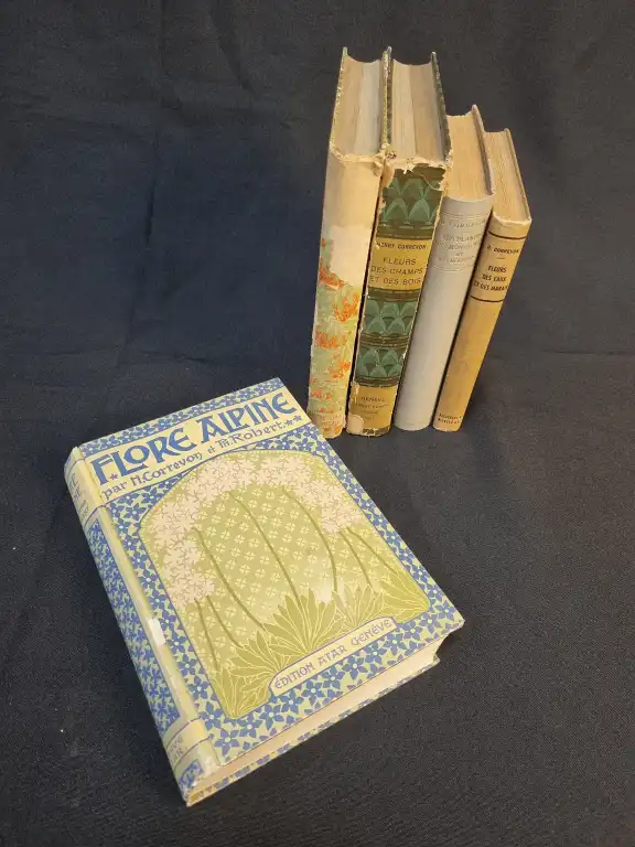 [BOTANIQUE] CORREVON (Henry) - Ensemble de 5 livres (défauts aux cartonnages dt manque de papier): - La Flore Alpine - Illustrée, par Ph. Robert, de 100 aquarelles donnant de 180 études de fleurs Genève, Edition Atar, s.d. - In 8°, cartonnage illustré de l'éditeur - Nos arbres dans la nature - Illustré de 100 planches en couleurs - Genève, Atar, Paris, Baillière, sd - In 8°, cartonnage illustré de l'éditeur - Fleurs des champs et des bois - Illustré de 100 planches en couleurs de S. Rivier - Geneve, Kundig, 1911 - In 8°, cartonnage illustré de l'éditeur - les premières pages de garde fantaisie sont collées ensemble - Fleurs des eaux et des marais - Delachaux, 1938 - In 12°, percale illustré éditeur (numéros au stylo dans les marges) - Les plantes des montagnes et des rochers - Avec 19 figures dans le texte - Genève, 1914 - In 12°, demi-bradel percale grise