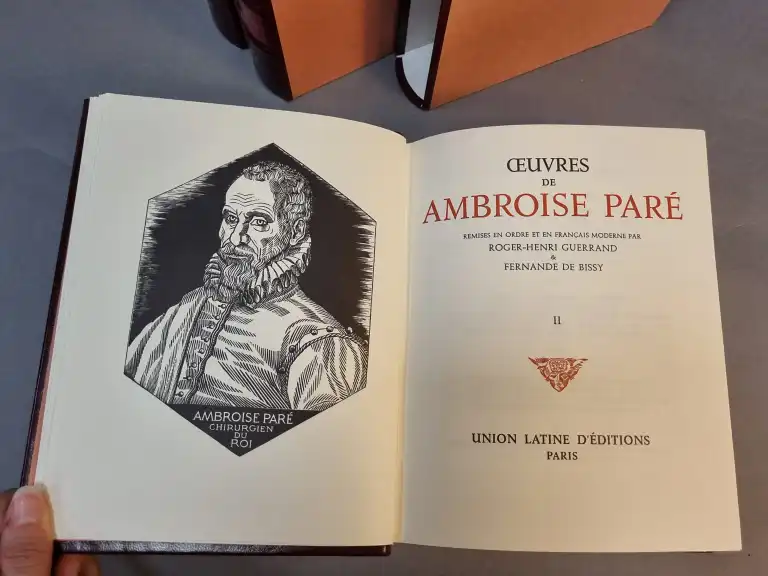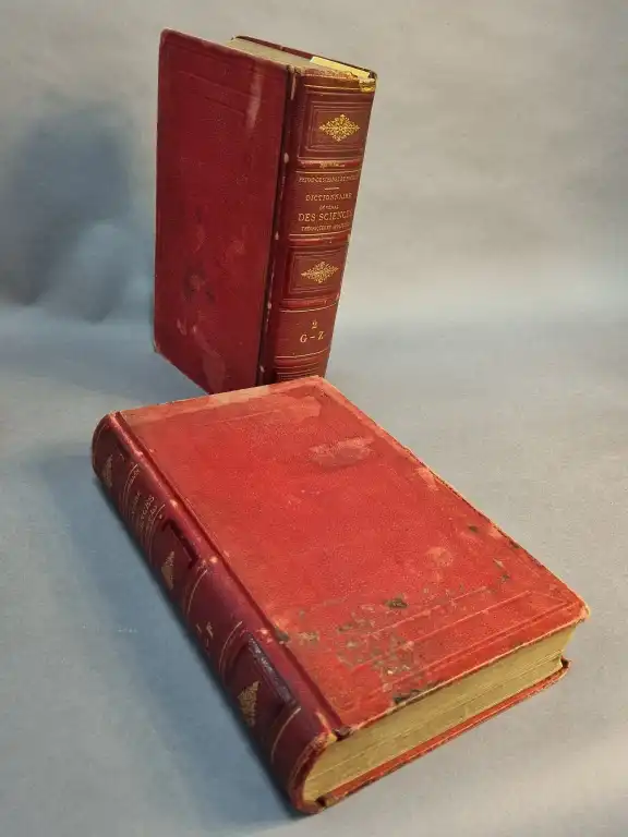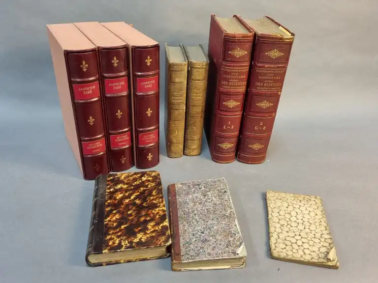SCIENCES - Ensemble de livres : - PARE (Ambroise) - Oeuvres complètes - paris, Unioin latine d'édition, sd - 3 (sur 4) vol. petit in 4°, simili-maroquin bordeaux, dos à nerfs, p. de t. et de t., étui - manque le tome 4 - ANDRE - Les nouvelles maladies nerveuses - Paris, Doin, 1892 - In 12°, demi-basane brune, dos lisse - Livret de la jeunesse contenant : la manière de teindre les crins, , différens tours et amusements - Moulin, Burelle, 1806 - In 12°, couv. d'attente (piqures) - Uranographie de la jeunesse ou leçons de sphères et d'astronomie - Paris, Périsse, 1843 - In 12°, demi-chagrin, dos lisse (défauts) 4 planches dépliantes - ORIFLA - Elements de chimie - Paris, Fortin, 1845 - 2 vol. in 8°, demi-percale brune, dos lisse (dos insolé, frottis) (piqures, mouillures) 10 planches HT - Dictionnaire général des sciences theoriques et appliquées - Paris, Delagrave, 1883 - 2 vol. petit in 4°, demi-chagrin rouge, rel. éditeur (défauts)