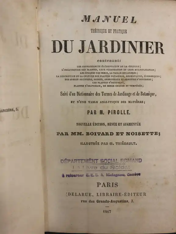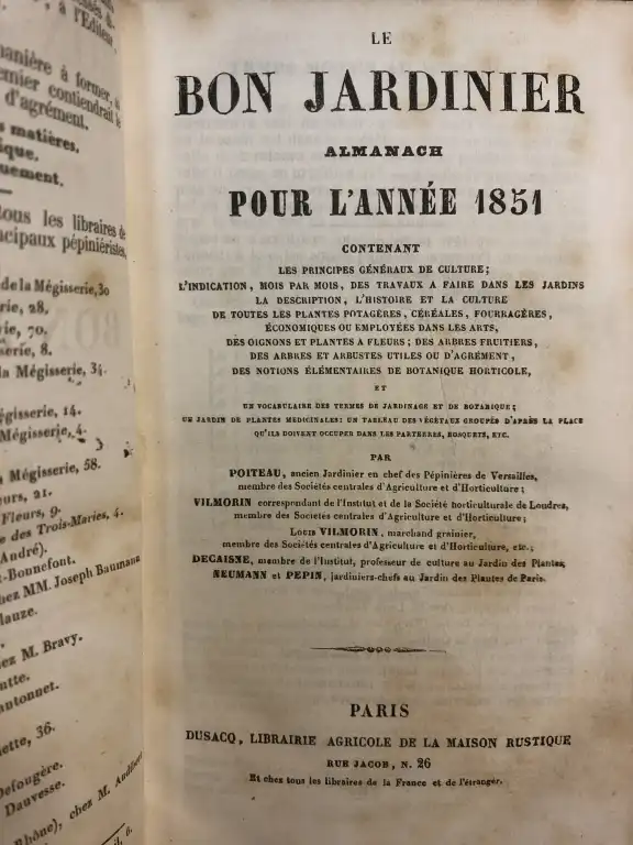 [BOTANIQUE] Ensemble de 6 livres : - VILMORIN - Les fleurs de pleine terre - 5ème édition - Paris, Vilmorin, 1909 - Ft vol gd in 8°, demi-chagrin brun, dos à nerfs, (défauts dt reliure frottée, coins émoussés, mouillures,...) - GATIN - Dictionnaire aide-mémoire de botanique - Paris, Chevalier, 1924 - Ft in 12°, demi-percale grise éditeur - Le bon jardinier almanach 1851 - Paris, Dusaq, sd - Ft in 12°, demi-basane verte, dos lisse (défauts dt reliure épidermée, mors fragiles, ....) - PIROLLE - Manuel pratique et héorique du jardinier - Paris, Delarue, 1867 - In 12°, demi-papier fort, dos lisse, p. de titre verte (défauts dt mors frottés,...) (cachet humide) - PUCCI - Les cypripedium et genres affines - Florence, 1891 - In 12°, demi-basane bleue, dos lisse (défauts dt mors fragiles,...) - PAGE - Arboriculture fruitière pratique - Geneve, Roto-Sadag, 1941 - In 8°, demi-toile bleue