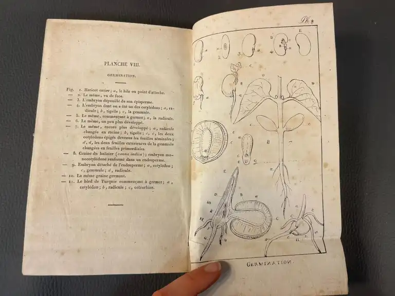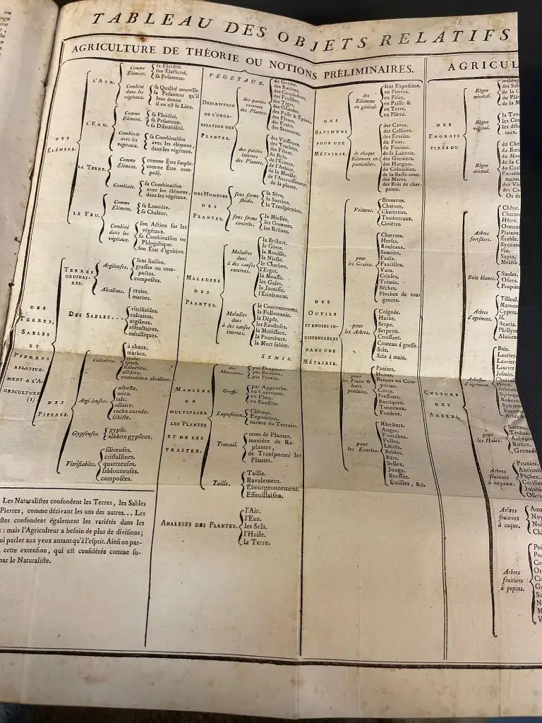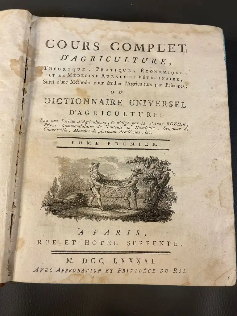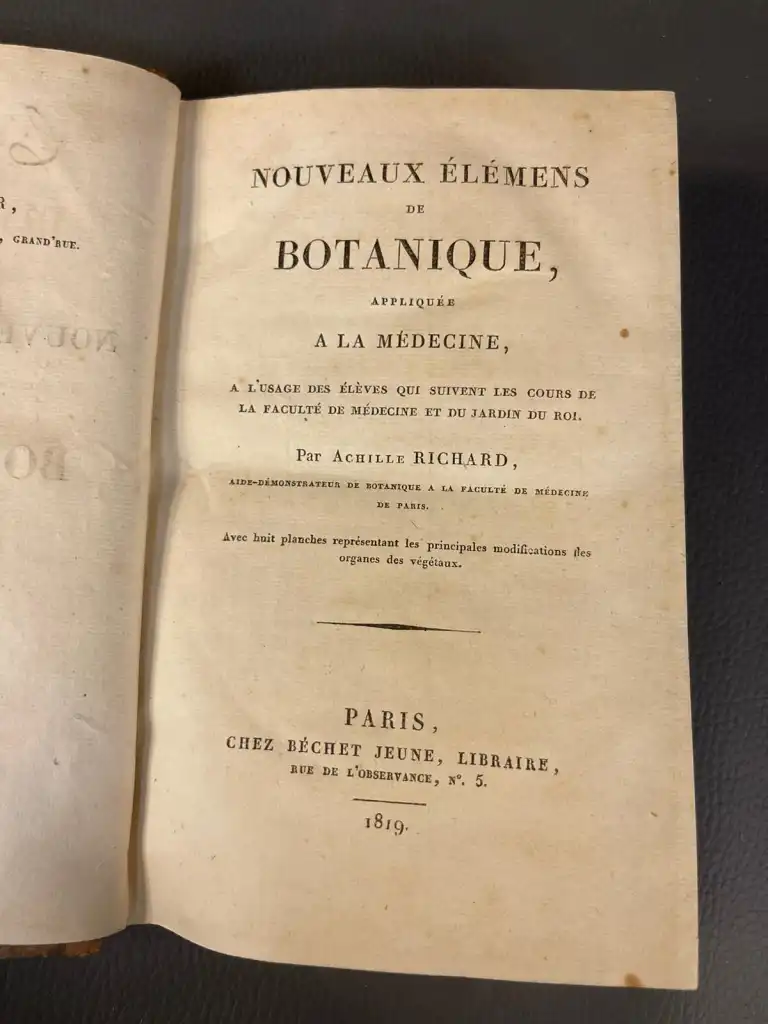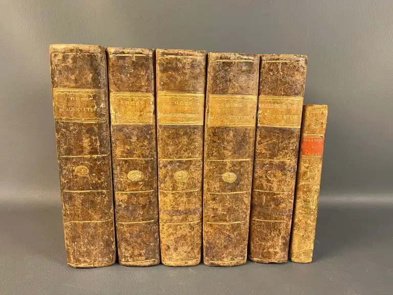 BOTANIQUE - Ensemble de 6 ouvrages : - RICHARD (Achille) - Nouveaux éléments de botanique appliquée à la médecine - Avec huit planches représentant les principales modifications des organes des végétaux - Paris, Béchet Jeune, 1819 - In 8°, basane, dos lisse orné, p. de titre rouge, tr. mouchetées (défauts) (rousseurs) complet des 8 planches - ROZIER - Cours complet d'agriculture,... ou dictionnaire universel d'agriculture - Paris, Serpente, 1791-86 - 5 vol. sur 9 manque le t2, 7, 8 et 9, in 4°, demi-basane à coins, dos lisse, tr. bleues (défauts dt mouillures, rousseurs, coins émoussés, épidermures) Illustré de 106 planches HT sur papier bleuté (dans le T5 il ya 2bis et 15 bis et manque planche 19)