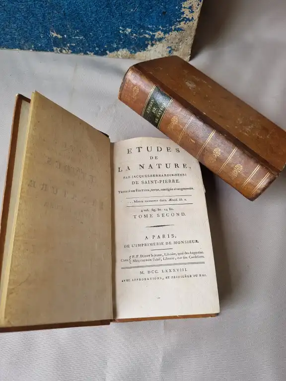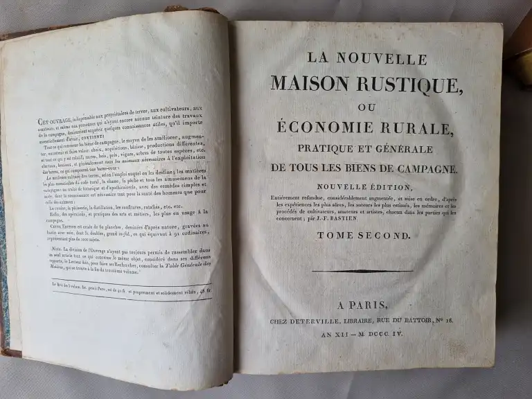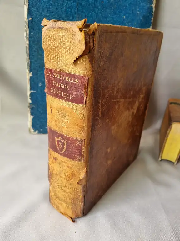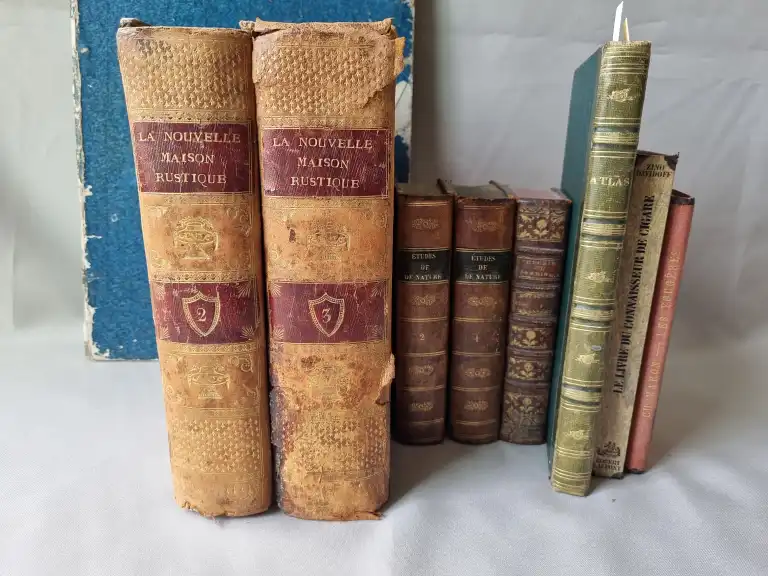 Ensemble de livres : - PLANCY (Comte de) - L'administration de l'agriculture appliquée à une exploitation - Paris, Huzard, 1822 - In folio, cartonnage papier bleu, (défauts à la reliure) - La nouvelle maison rustique ou économie generale, - Nouvelle édition - T 2 et 3 - Paris, Deterville, 1804 - 2 vol (sur 4) in 4°, basane, dos lisse, p. de titre et de tomaison rouge, (défauts dt reliure usagée, mouillures, rouss., ...) - Atlas de botanique en 3 parties - Sl, sn, sd - Gd in 8°, demi-maroquin vert à long grain, dos à nerfs orné (défauts dt dos insolé, piqures, mouillures, ...) - Illustré de 15, 26 et 9 planches HT accompagnées de l'explication - SCHABOL - La théorie et la pratique du jardinage, ... - Paris, Desprez, 1767 - T1 seul, in 12°, - Le tome 1 comprend le dictionnaire - Illustré de 20pl. num. 1 à 19 (2pl. sont num. 8) et d'un frontispice - HOOKER - Les fougères - Paris, Doin, 1896 - In 12°, percale éditeur (petits défauts) - SAINT PIERRE - Etudes de la nature - 3ème édition - Paris, impr. de monsieur, 1768 - 2 vol. in 12°, demi-basane, dos lisse, p. de titre, tr. mouchetées, (défauts dt frottis, mouillures, ...) - Illustré de 5 planches HT (dt le frontispice) - DAVIDOFF - Le livre du connaisseur de cigare - Laffont, 1977 - In 8° étroit, cartonnage éditeur