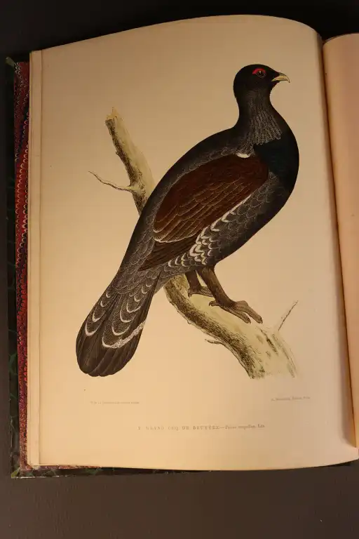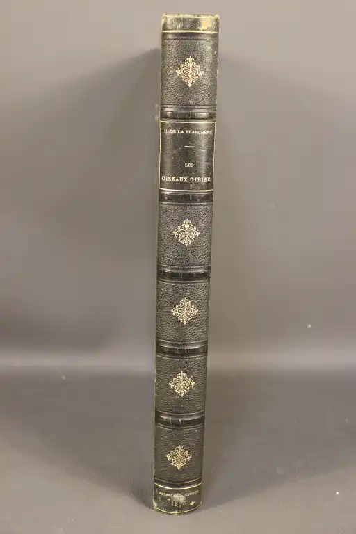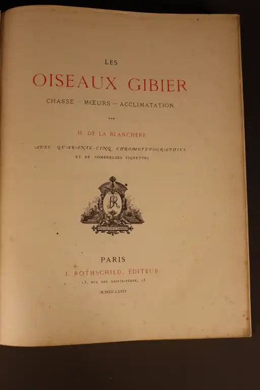 LA BLANCHERE (H.de) - Les oiseaux gibier. Chasse-moeurs-acclimatation - Paris, J. Rothschild, editeur, 1876 - Petit in-folio, demi-chagrin noir, dos à nerfs orné, tranches dorées (frottis, mors interieur fragile) (piqures, traces d'humidité) Illustré de 45 planches en couleurs hors-texte avec serpente Edition originale