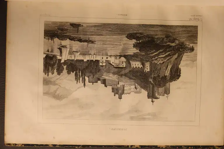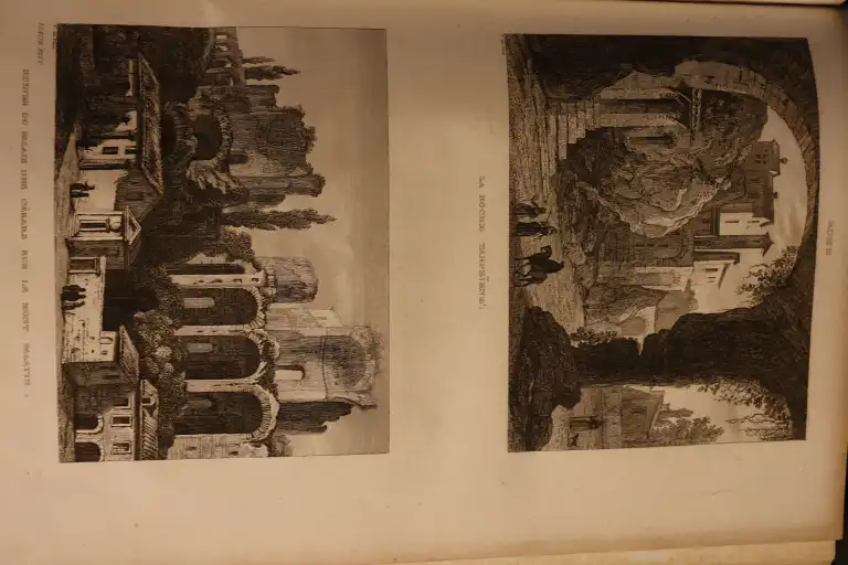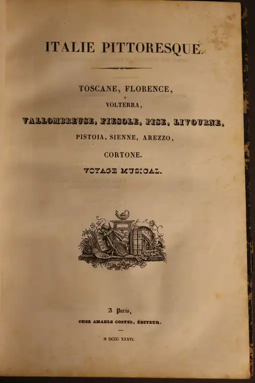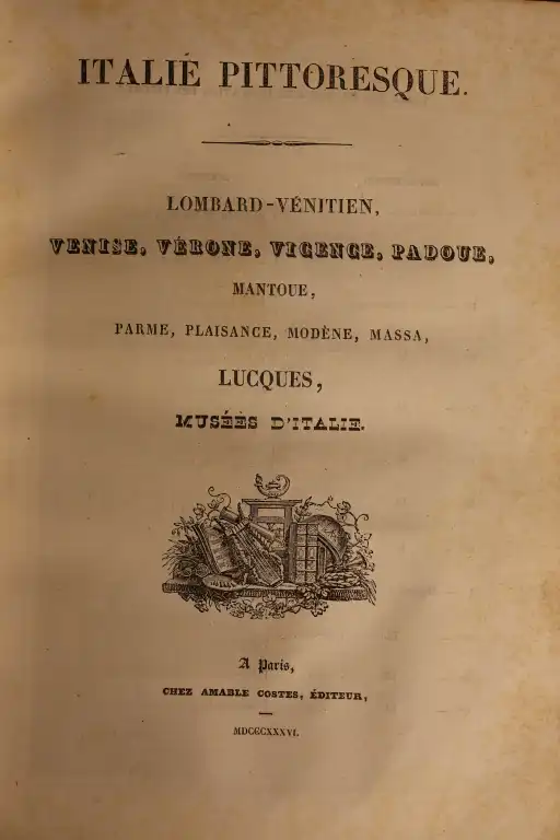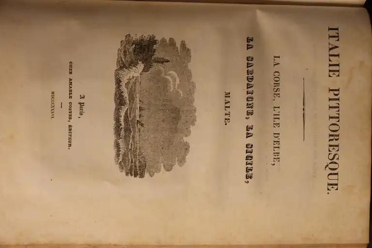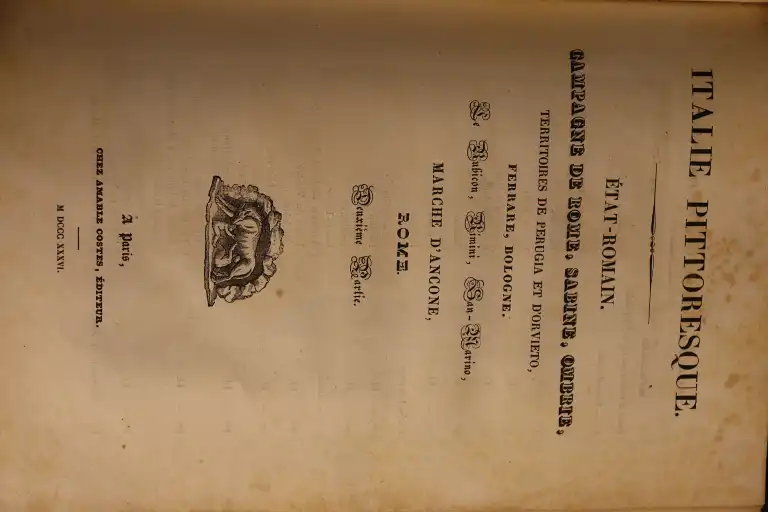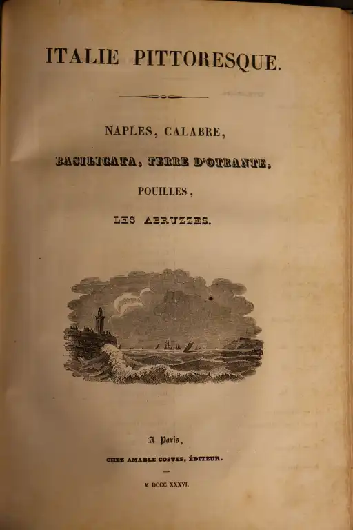 COLLECTIF - Italie pittoresque - Paris, Amable Costes, 1834-1836 - Gd in 8°, demi-basane, dos lisse (reliure frottée) atlas des parties 1 et 2, page de titre avec liste des gravures - 134 gravures sur acier (dt 3 planches non annoncées : rome, femme de Frascati, Pompéi maison du poete et 1 annoncée manquante : colonie albanaise et 2 cartes dépliantes (mouillures, piqures, papier jauni)