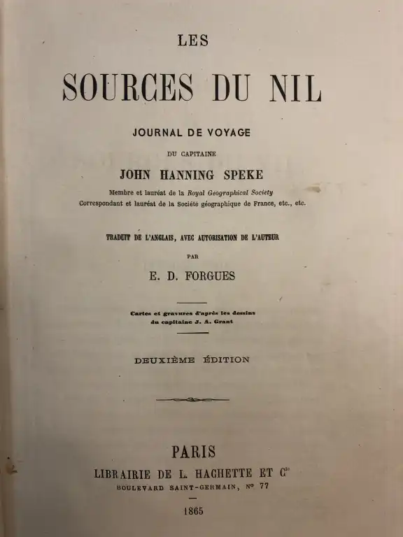 [VOYAGE] Ensemble de 4 ouvrages : - SPEKE (John Hanning) - Les sources du Nil, journal de voyage du capitaine John Hanning Speke (...). Traduit de l'anglais avec l'autorisation de l'auteur par E. D. Forgues - Deuxième édition - Paris, Hachette et Cie, 1865 - Gd in 8°, demi-chagrin brun, dos à nerfs orné, tr. dorée - Ouvrage orné de trois cartes et de gravures H.t d'après les dessins du capitaine J.A Grant (petits défauts dt dos lgt insolé, petits frottis,...) - VANDERHEYM (J.-G.) - Une expédition avec le Négous Ménélik. Vingt mois en Abyssinie. Ouvrage contenant soixante-huit illustrations d'après les photographies de l'auteur - Paris, Hachette, 1896 - In 12°, demi-basane prune, dos à nerfs (petits défauts) (papier jauni) - DUVERNE (G.) - De l'Atlantique à l'Océan Indien (Konakry-Djibouti) avec la mission Tranin-Duverne 1er novembre 1924 - 9 avril 1925 - Paris, Gianoli et valentin,sd - In 8°, demi-percale verte, dos lisse, couv. cons. - Illustrations HT - ALDRED - Old kingdom art in ancien Egypt - London, Tiranti, 1949 - In 12°, toile noire éditeur (défauts)