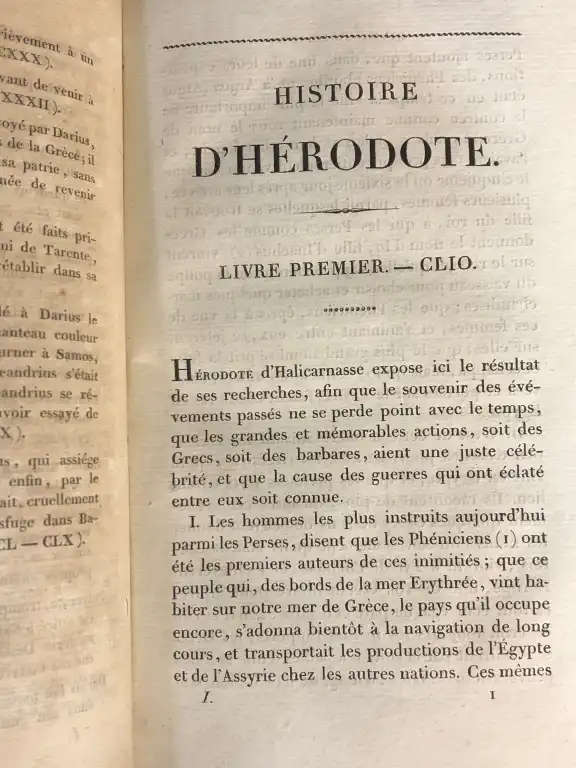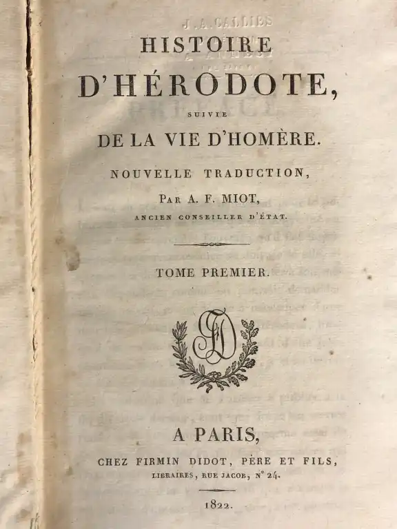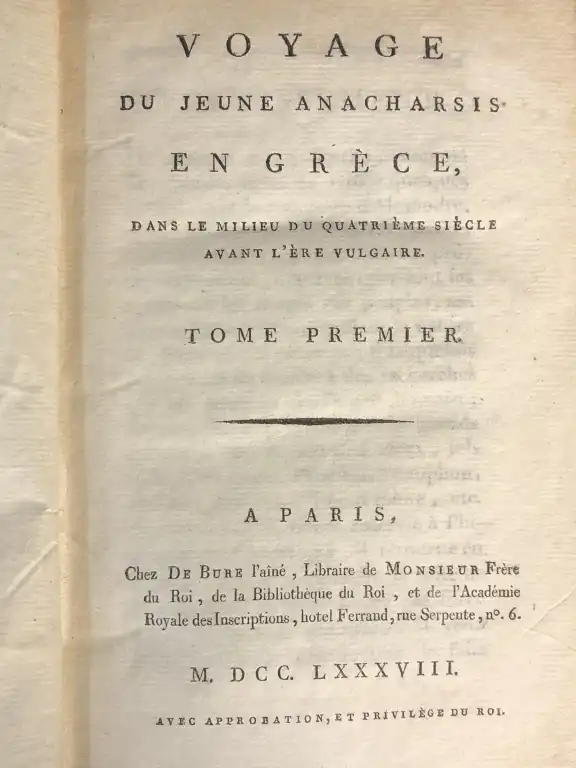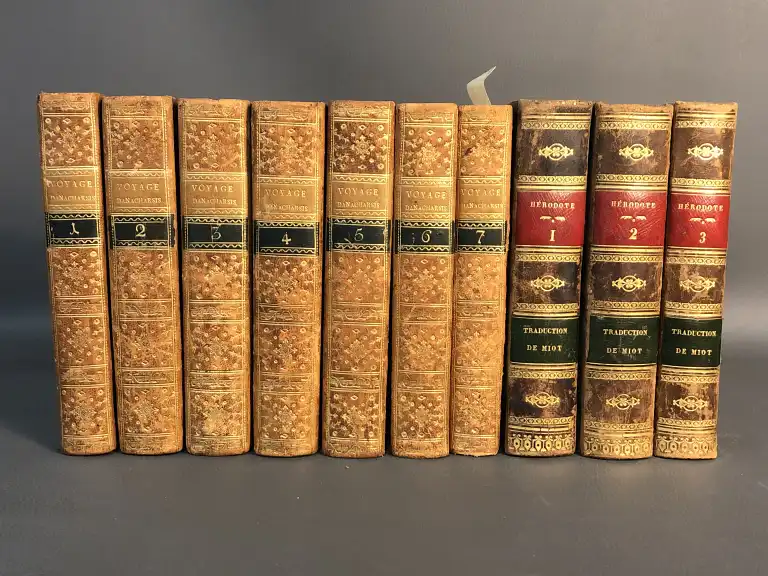 VOYAGE - Ensemble de 10 volumes : - Voyage du jeune anacharsis en Grèce, dans le milieu du quatrième siècle avant l'ère vulgaire - Paris, de Bure, 1788 - 7 vol. in 8°, xxiv, 382, [1], [3] 568 [1], [3] 560 [1], [3] 564 [1, [3] 543 [1], [3] 511, [3] 130 [1]cccxxij [1] demi-chagrin blond à coins, dos lisse orné, p. de titre et de tomaison, tr. jaunes, (des défauts à la reliure dt le t7 mors fendu, coins émoussés, frottis) (mouillures) - MIOT - Histoire d'Hérodote suivie de la vie d'Homère - Paris, Firmin Didot, 1822 - 3 vol. in 8°, dos lisse, p. de titre rouge et verte, basane, tr. mouchetées, guirlande dorée sur les coupes (petits défauts dt frottis à la reliure) (cachet humide) 1 carte dépliante in fine du T3