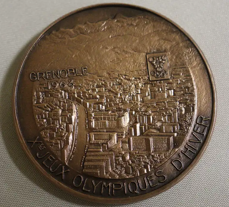 Jeux Olympiques d'Hiver/ GRENOBLE 1968. Médaille officielle en bronze de participant pour les Jeux Olympiques d’Hiver, représentant d'un côté le profil d'un athlète sur fond de givre, signé J.M. Coeffin et de l'autre, Grenoble vue du ciel. (D. : 6 cm)