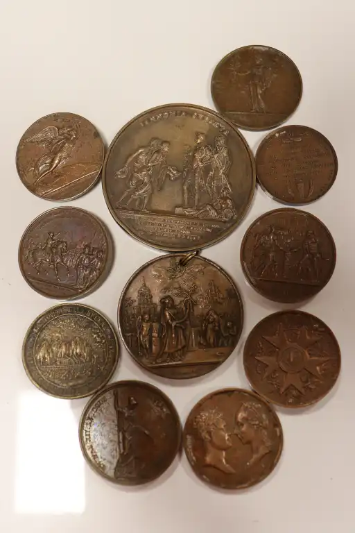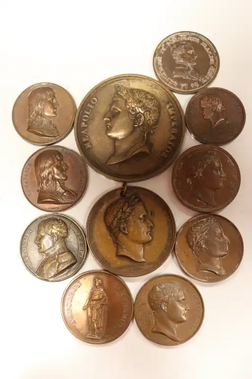 Napoléon Premier. Lot de 11 médailles en cuivre ou bronze, dont : Pannonia subacta - Confédération du Rhin - Paix de Luneville - Auspice Neapoleone Gallia Renovata - Bataille d'Austerlitz - Napoléon en Egypte - Translation depuis Sainte-Hélène - Code civil - Bataille de Montenotte.