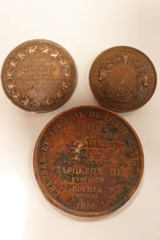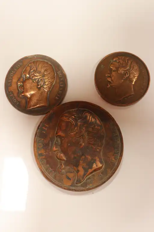 Napoléon III. Trois médailles en cuivre. Création d'un port de commerce à Porstrein 1859 ; Election du président 1848 ; Société générale de l'Agriculture Générale de l'Yonne.