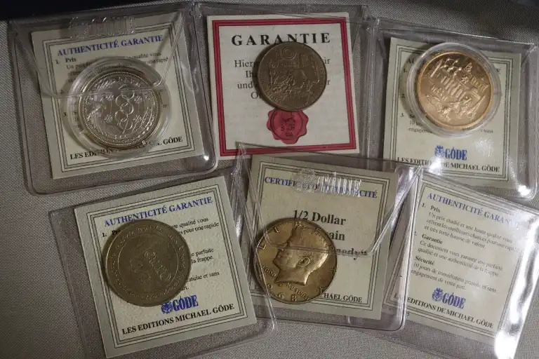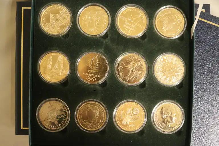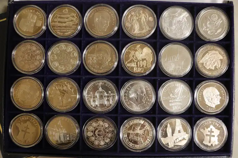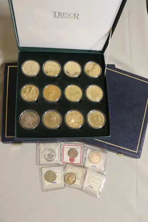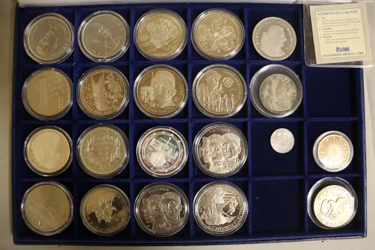 On joint : - 1 Coffret de 18 médailles commemoratives : De Gaulle, Papales, etc... et 2 monnaies dont un dollar doré.