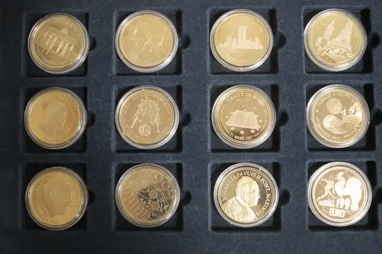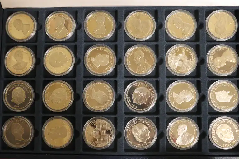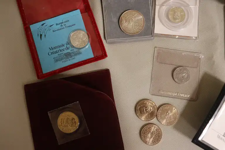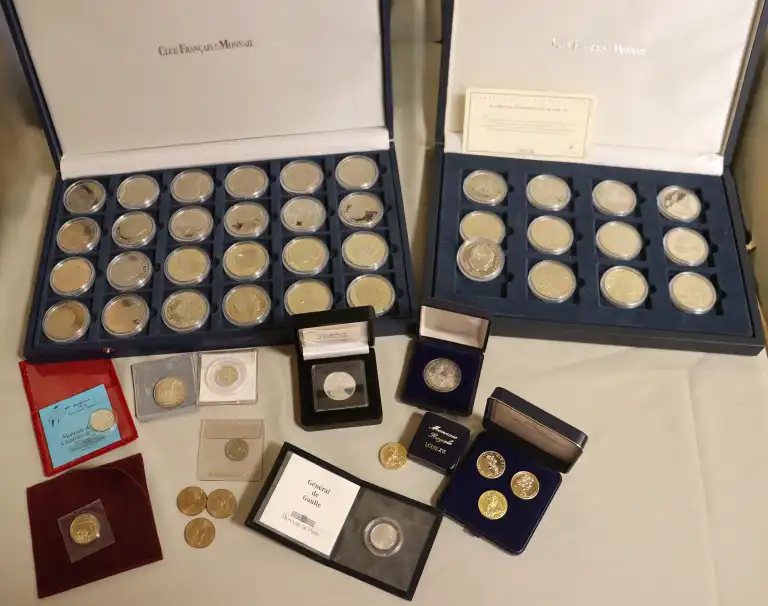 Ensemble comprenant 2 Coffrets du Club Français de la Monnaie et 11 boites et pochettes contenant divers monnaies et médailles dont quelques unes en argent dont un 10 Ecu en argent