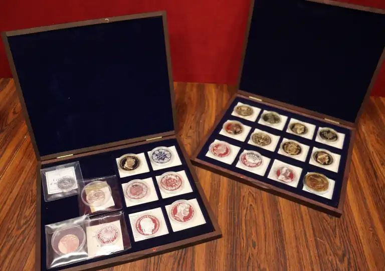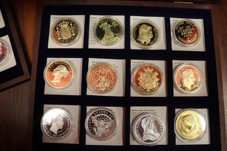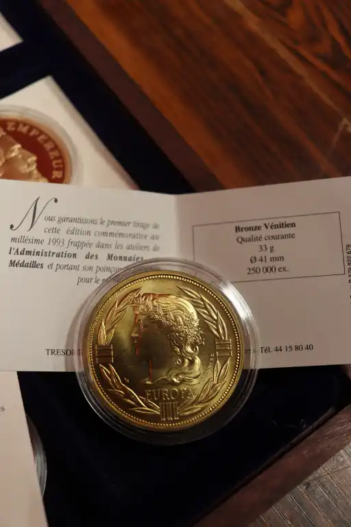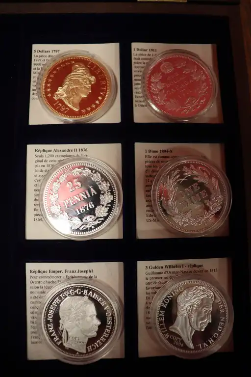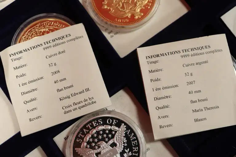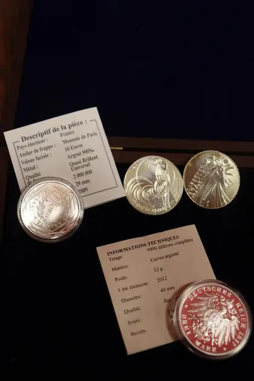 Lot de deux coffrets Illustres Répliques de pièces en cuivre doré et argenté, chacune avec son certificat. On joint : 10 Euros Coq argent 2014, 10 Euros Coq argent 2016, 10 Euros Semeuse argent avec certificat